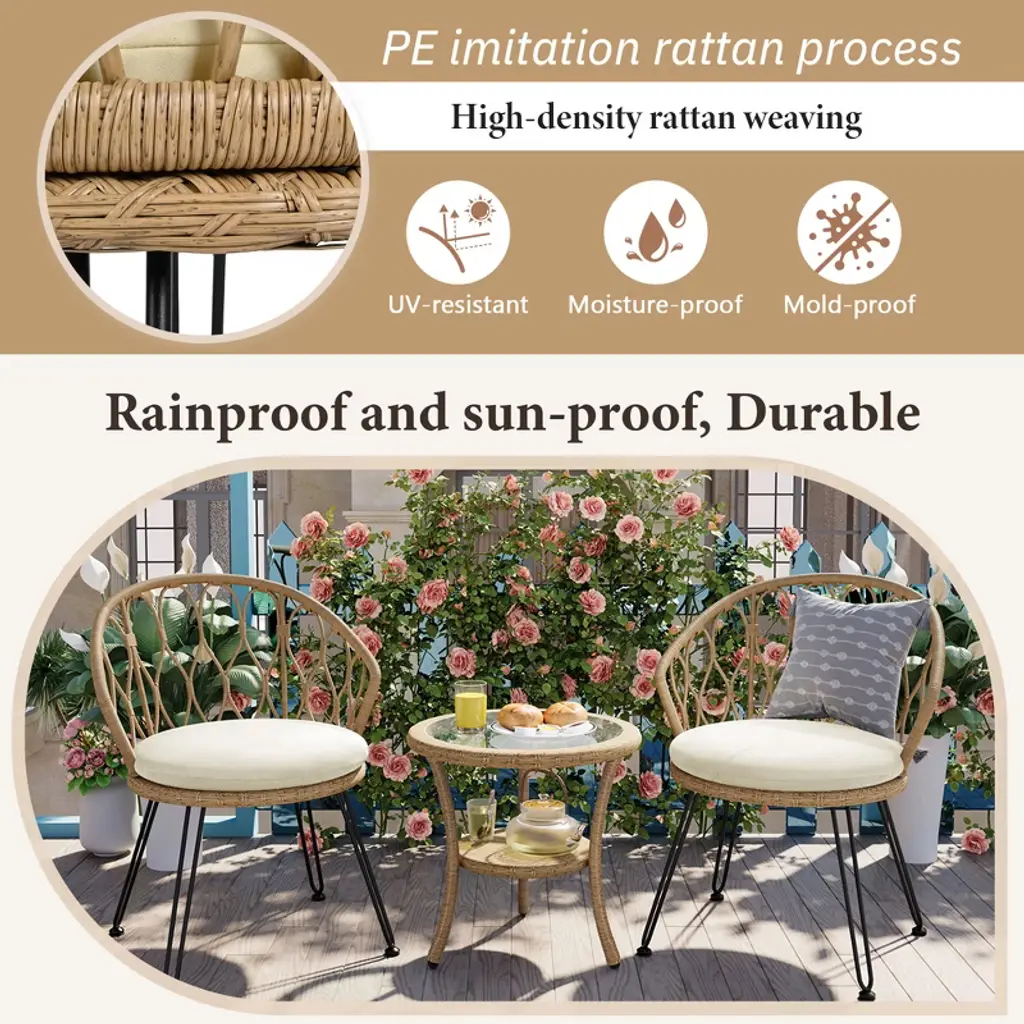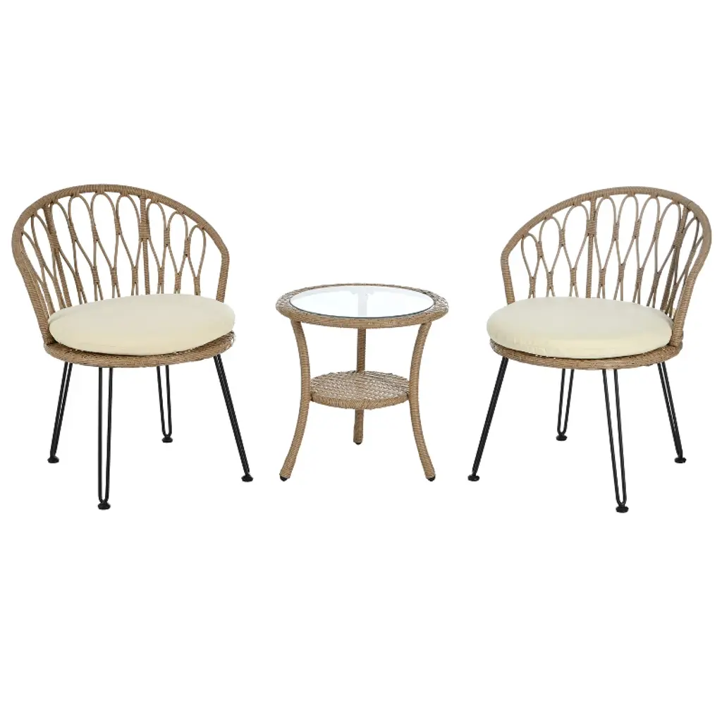 Create a cozy outdoor retreat with this elegant 3-piece wicker bistro set, ideal for patios, balconies, and intimate garden corners. The set includes two curved-back rattan chairs with plush beige cushions and a matching round table topped with tempered glass, combining comfort and style with functionality. The powder-coated steel legs offer durability and stability, while the synthetic wicker weave provides a classic look that resists the elements. Whether you're sipping coffee at sunrise or enjoying evening drinks, this compact set brings charm and relaxation to any outdoor setting.