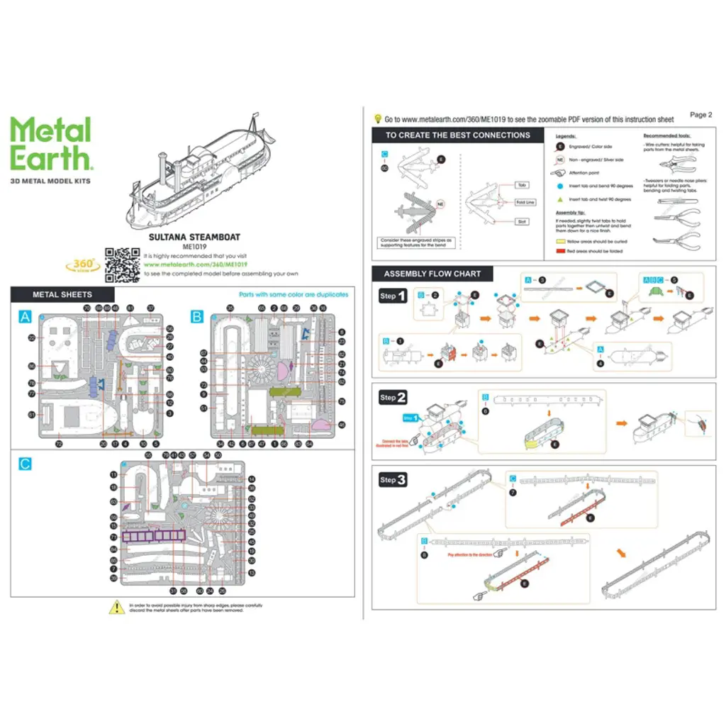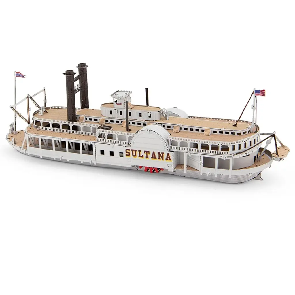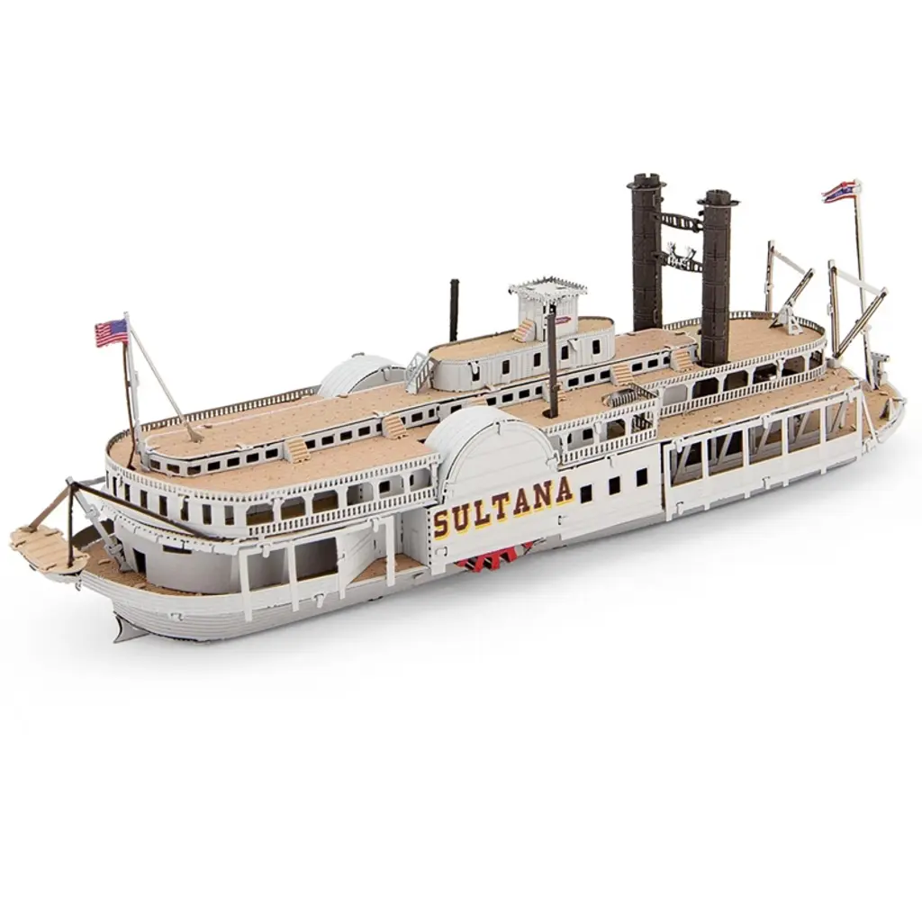 Brand new Sultana Steamboat (Moderate Difficulty) Steel Model Kit by Metal Earth. Brand new box. Detailed exterior. Includes 111 parts. Highly detailed model kit. Difficulty level: Moderate. Officially licensed product. This model does not have any openings. Assembled dimensions approximately L-5, W-1.3, H-1.65 inches. No glue or paint is required, but tweezers or similar tools are recommended. The Sultana was a commercial side-wheel, Mississippi steamboat that sank in 1865 killing 1,169 passengers and crew. Many of those who died were union soldiers who had just been released from a confederate prison camp. This tragedy remains the worst maritime disaster in United States history.