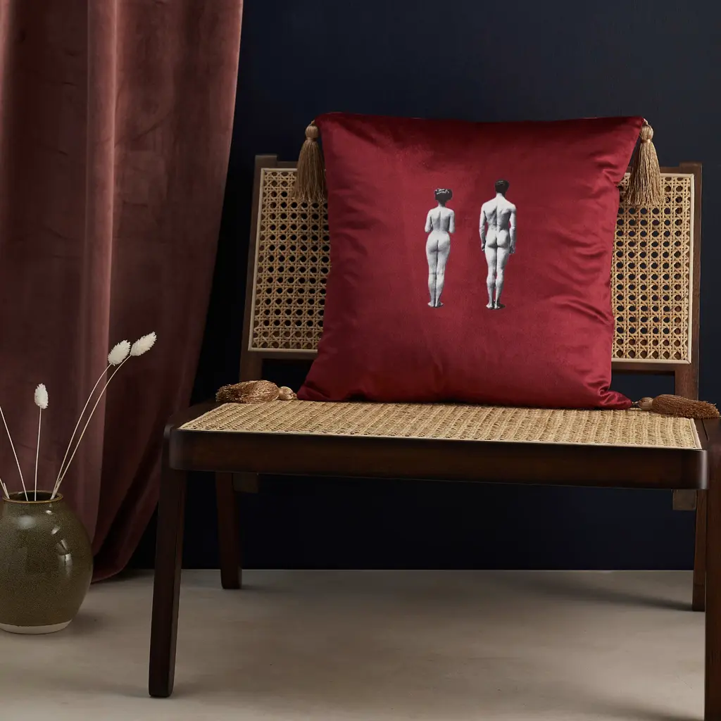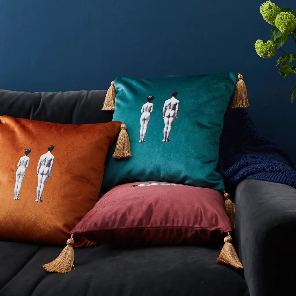 A sumptuous velvet cushion featuring the Models design in jewel toned shade of Deep Berry Red. A truly luxurious update to any room.Made in England, each cushion is finished by hand with elegant burnished gold tassels and features a hidden zip.Perfect on it’s own or mix and match to combine your choice of designs and colors to create a unique look.Models cushion also available in burnt orange, vintage rose and lush meadow green.Plump feather inner cushion pad included.