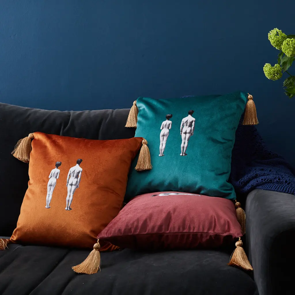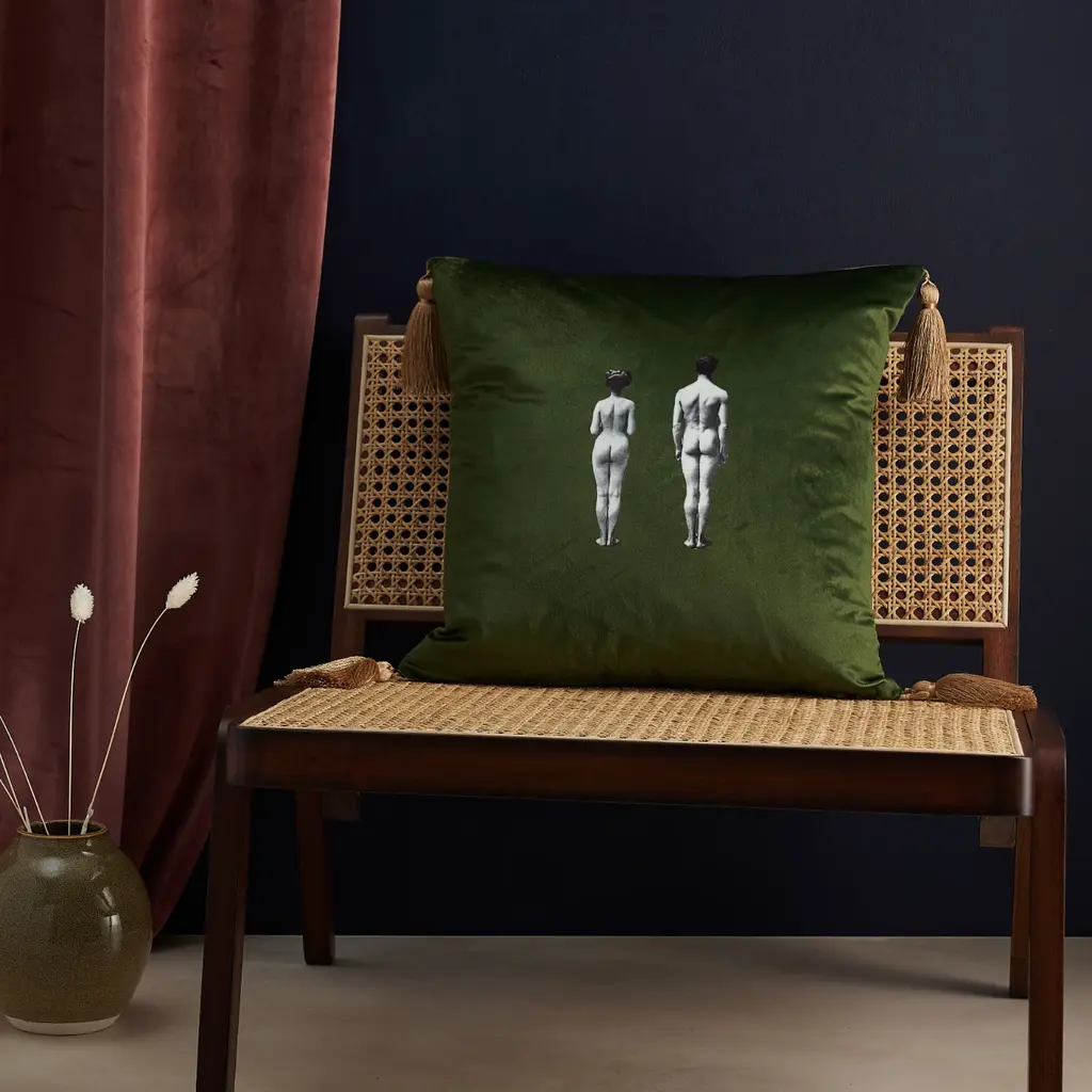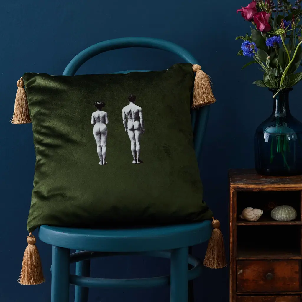 A sumptuous velvet cushion featuring the Models design in lush meadow green from the Melody Rose 'Modern Surrealist' collection.Inspired by the Surrealists of the early 20th century, the design pays homage to the movement which finds magic and beauty in the unexpected and the uncanny, the disregarded and the unconventional.Perfect on it’s own or mixed and matched, the design is available in a range of colours.Made in England, each cushion is finished with elegant handmade burnished gold tassels.Features hidden zip and plump duck feather inner cushion pad.