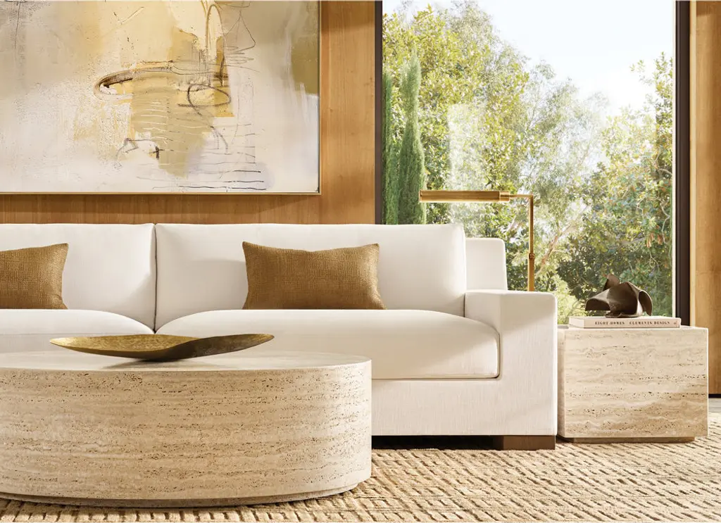 A pure, architectural interpretation of comfort, influenced by 1970s designs in both Italy and the United States. Its broad frame shapes the arms and wraps the deeply cushioned seating in a continuous line. Handcrafted in the USA. ALSO AVAILABLE IN LEATHER SHOP THE ENTIRE COLLECTION