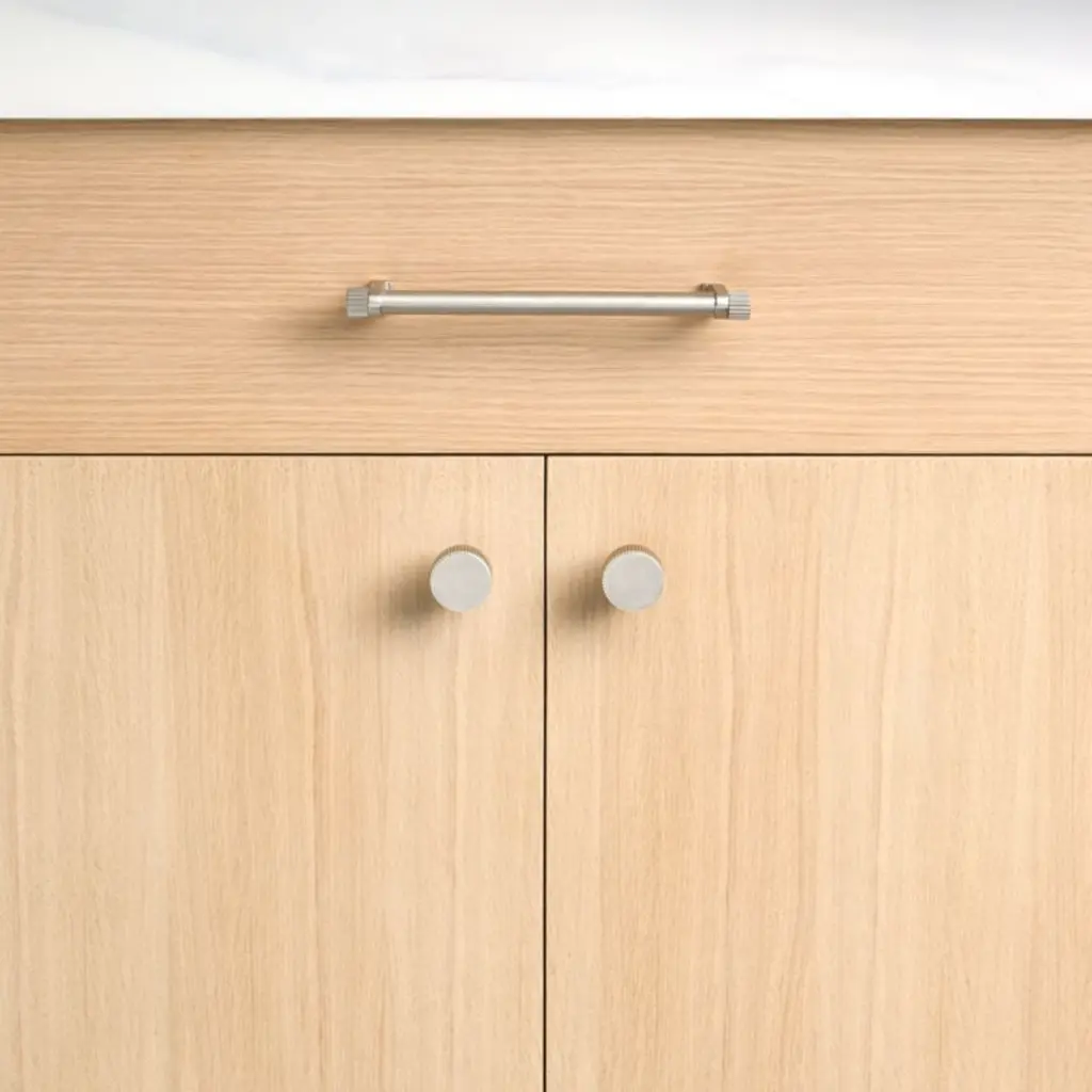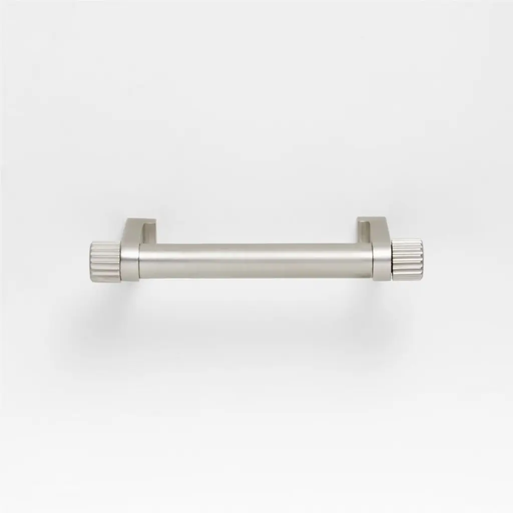 Sometimes it's the small things that pull a room together. That's why we've designed a hardware collection with modern silhouettes, clean lines and a touch of tradition to give your kitchen or bath that perfect finishing touch. Made of brass finished in brushed nickel, the drawer pull lends industrial chic to its minimalist design. Fluted ends bring texture to the round pull that's held in place by L-shaped anchors softened with rounded edges. The three-inch drawer pull easily fastens to drawers and doors with included hardware.