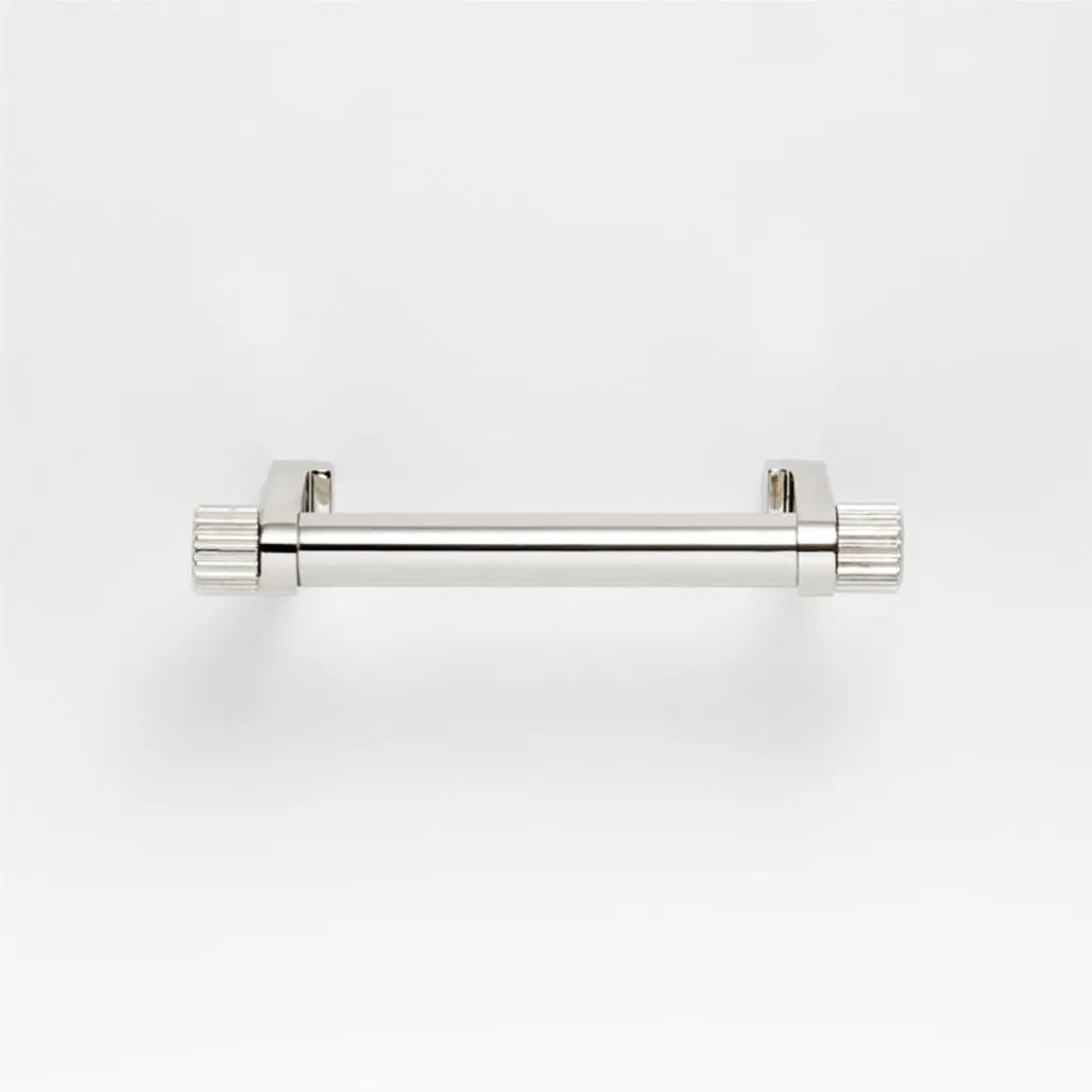 Sometimes it's the small things that pull a room together. That's why we've designed a hardware collection with modern silhouettes, clean lines and a touch of tradition to give your kitchen or bath that perfect finishing touch. Made of brass finished in shiny chrome, the drawer pull lends industrial chic to its minimalist design. Fluted ends bring texture to the round pull that's held in place by L-shaped anchors softened with rounded edges. The three-inch drawer pull easily fastens to drawers and doors with included hardware.
