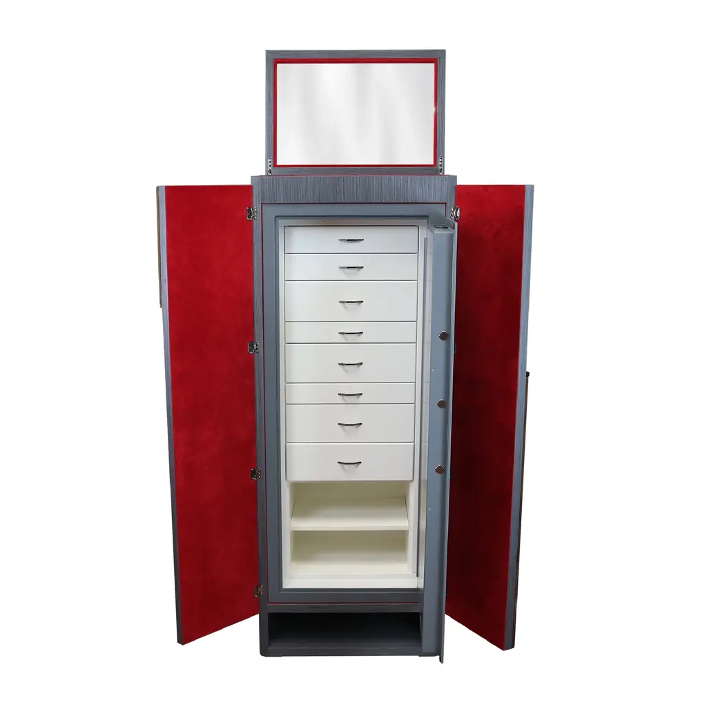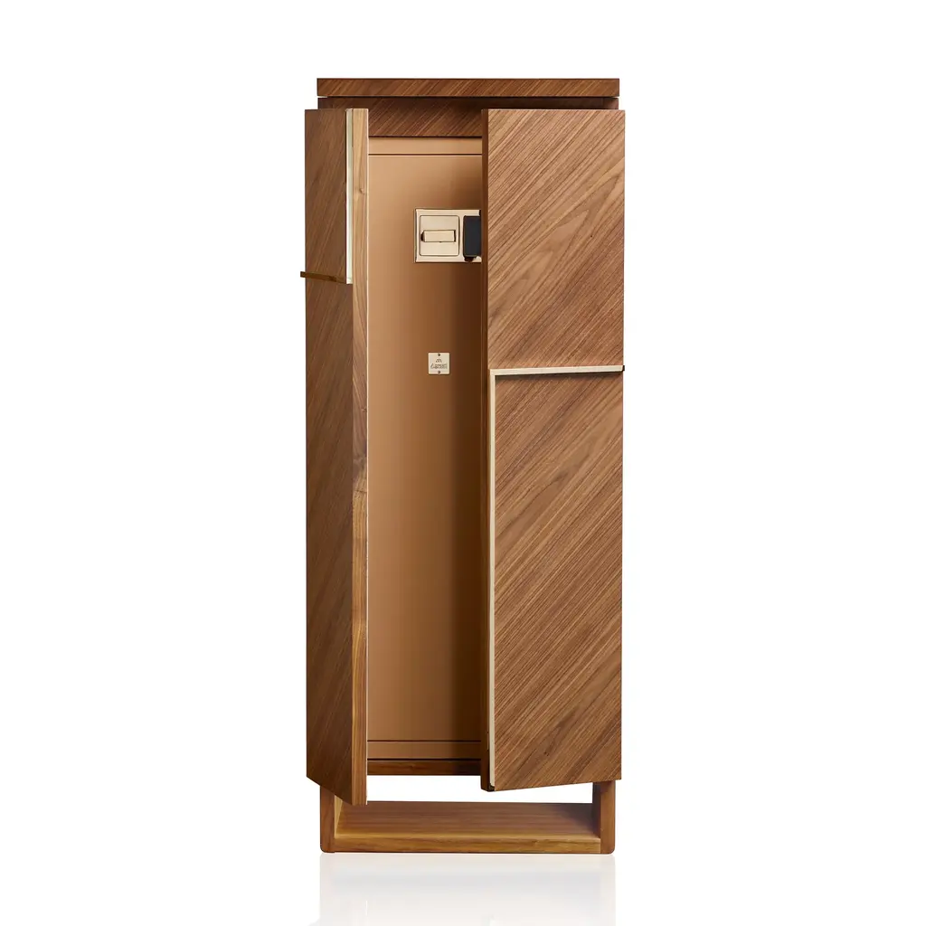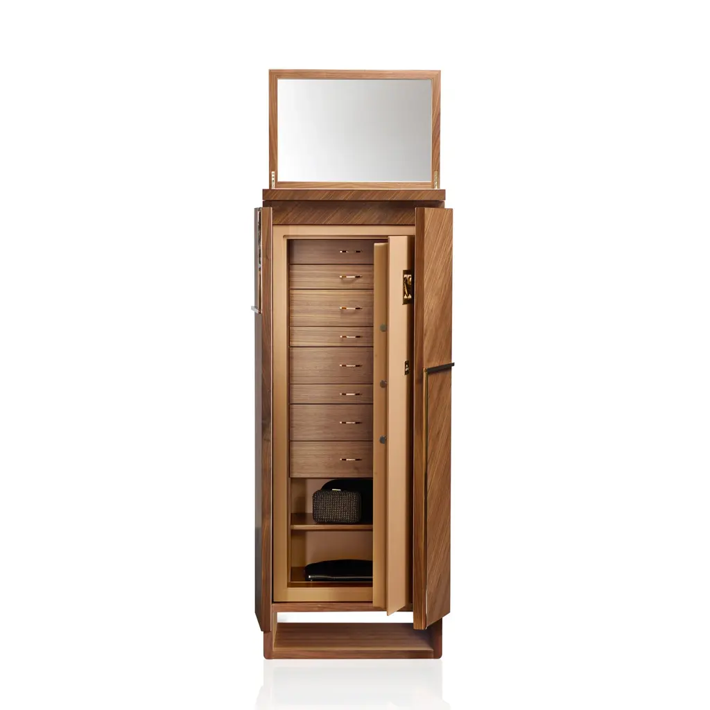 Since 1949, Agresti has crafted the pinnacle of luxury safes, trunks, and jewelry boxes in Florence, using only the finest materials, including full-grain leather, exotic woods, and textures like shagreen. As the premier name in high-end, custom solutions for safeguarding valuables, Agresti integrates cutting-edge security features: biometric access, secret compartments, unique keys, and hidden doorseverything you see in movies, they make real. Favored in multimillion-dollar estates, yachts, and private jets. Contact us to discover more about this exceptional product. Indulge in luxury with the Modern Armored Jewelry Cabinet by Agresti Gioia. This Canaletto Walnut and white maple cabinet features gold-plated brass accessories, adding a touch of opulence. With drawers lined in soft Ultrasuede and a secure matte gray oak safe, this cabinet is both stylish and functional.