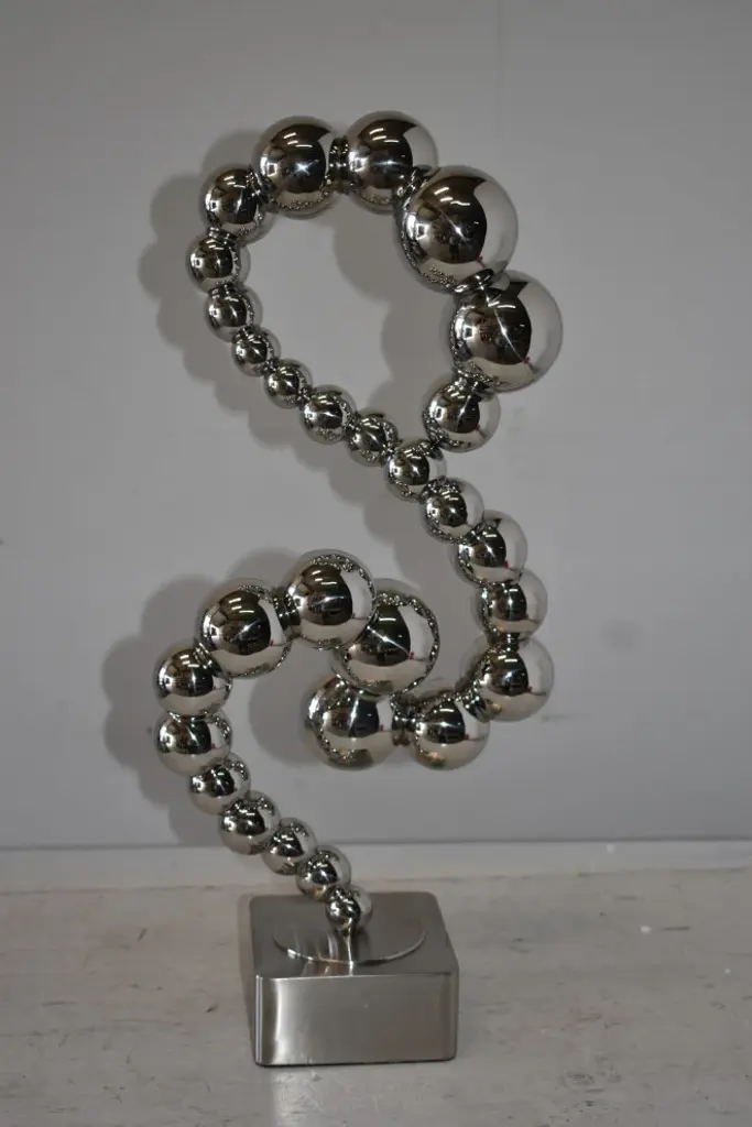 Decorate your home with this beautiful, tabletop, modern looking, stainless-steel abstract. These decorative abstracts made of Stainless-steel balls will become an extraordinary focal point to any kitchen, Livingroom, or patio! We sell a whole line of this style of modern art. You can be sure they will be a conversation starter and the topic of much appraised comments in your home. Size: 10"L x 7"W x 24"H. Weight is: 4Lb