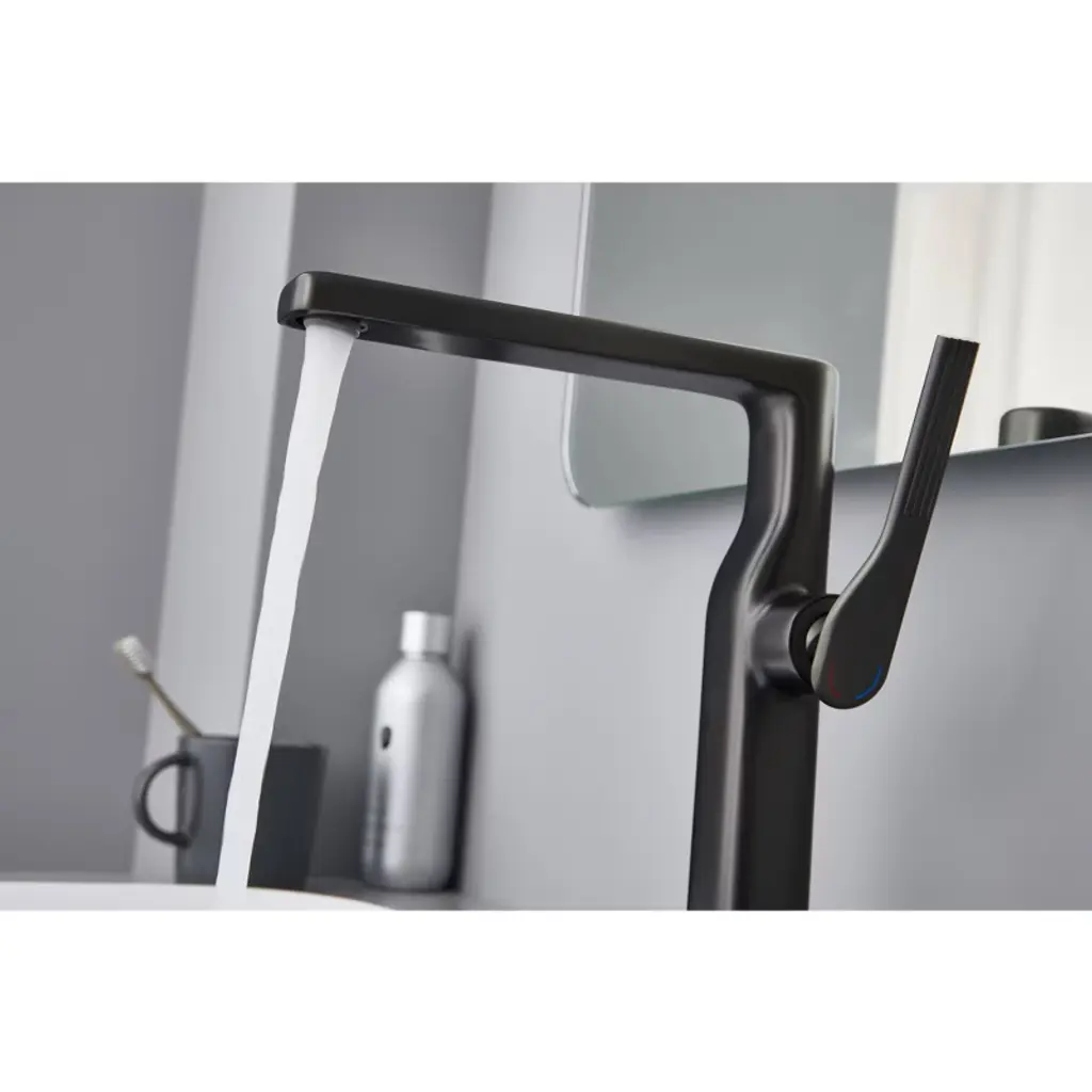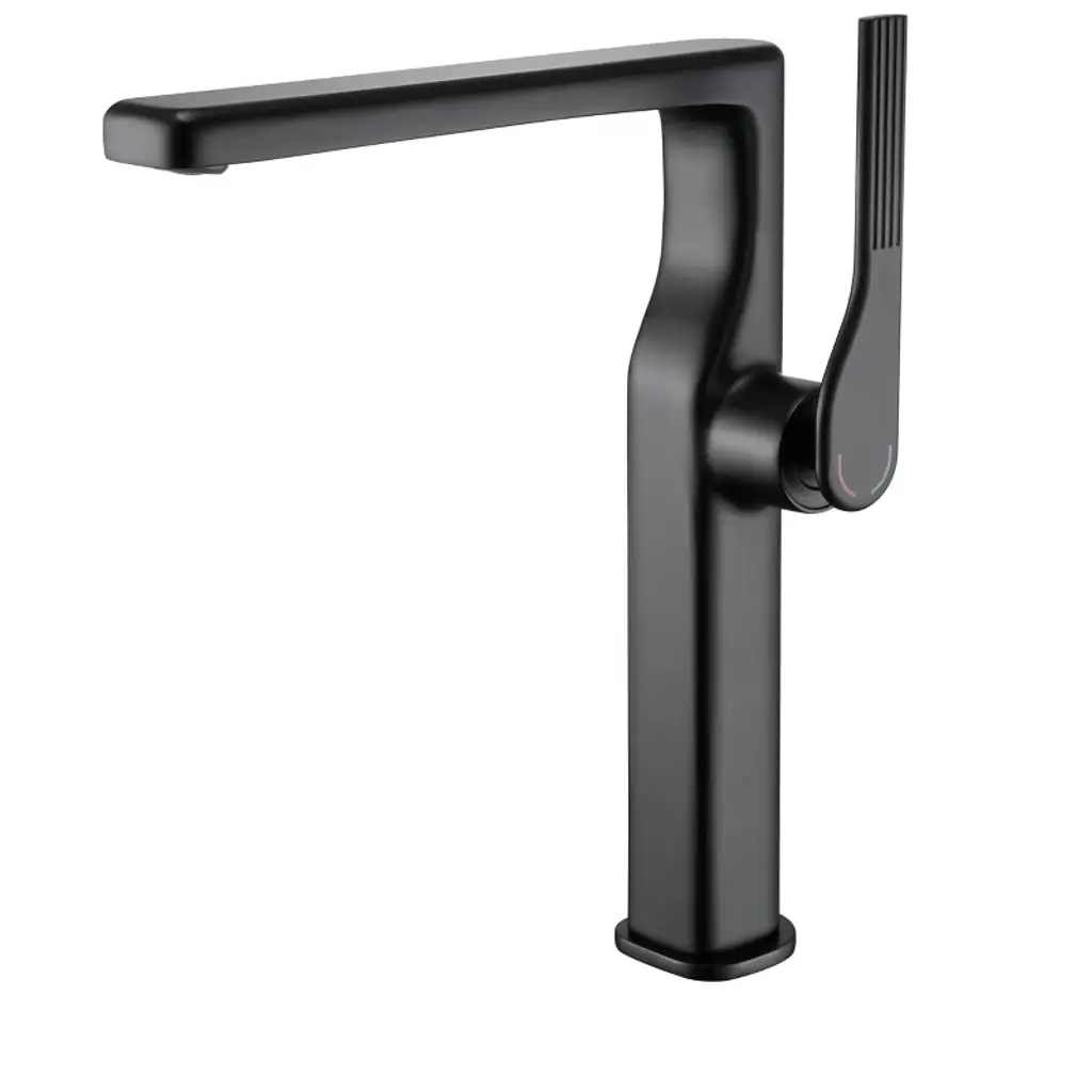 This modern minimalist bathroom faucet is a striking addition to any contemporary bathroom setting. Its sleek matte black finish and attention to detail in craftsmanship make it both a functional and stylish choice. The streamlined design not only enhances the aesthetic appeal but also ensures ease of use and water efficiency, making it a perfect blend of form and function.