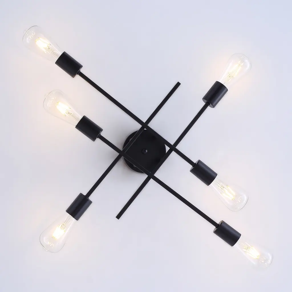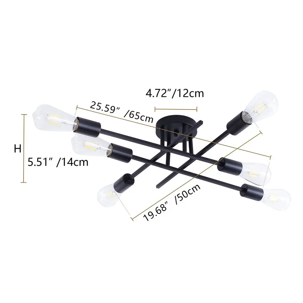 Specifications: Modern Design: Dressed in a black body finish, the Sputnik design ceiling light is crafted into an iron frame, creating a classic modern style.Quality Assurance: High-quality metal craft with painted finish. All products in the factory have to undergo rigorous safety monitoring, to ensure quality and safety.Easy Assembly: Don't worry about the installation difficulty, we will attach the installation instructions to you, with clear installation instructions, the operation can be completed quickly.Variety of Choices: Provide the most abundant categories of lighting products, to meet your needs. Our main products include LED Chandeliers, Pendant lights, Flush mount lights, Crystal Ceiling lamps, and island lights.Application: The black Sputnik design chandelier is perfect for the kitchen, bedroom, living room, bathroom, hallway, entryway, foyer, stairway, and so on.