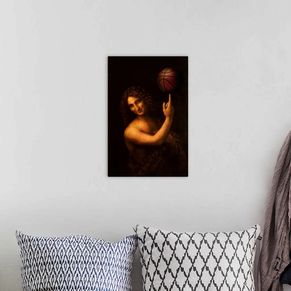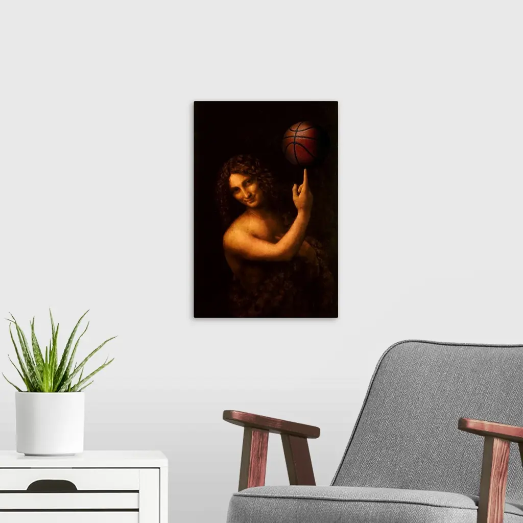A modern version of St. John the Baptist by Leonardo da Vinci, with a basketball.