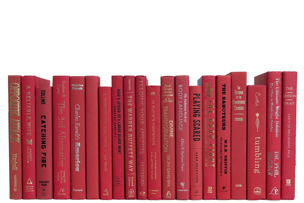 Transform your space with our Modern Cherry: Color By The Foot. Order as many linear feet as you need to complete your project. Authentic modern hardback decorative books in crisp and unified shades of deep (cool) red. All books are published 1980-present and include a variety of fiction and non-fiction titles. Each linear foot contains 10-12 books with an average height of 8.5-9.5". Exact titles will differ from those pictured.