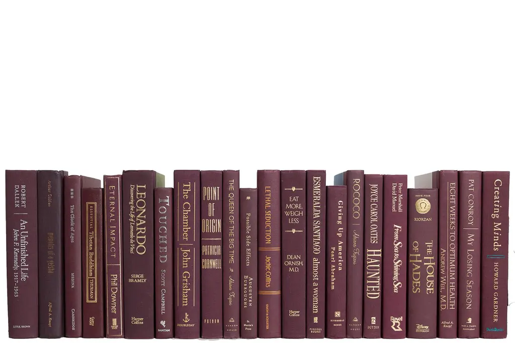 Transform your space with our Modern Merlot: Color By The Foot. Order as many linear feet as you need to complete your project. Authentic modern hardback decorative books in crisp and deep burgundy shades. All books are published 1980-present and include a variety of fiction and non-fiction titles. Each linear foot contains 10-12 books with an average height of 8.5-9.5'. Titles will differ from those pictured.