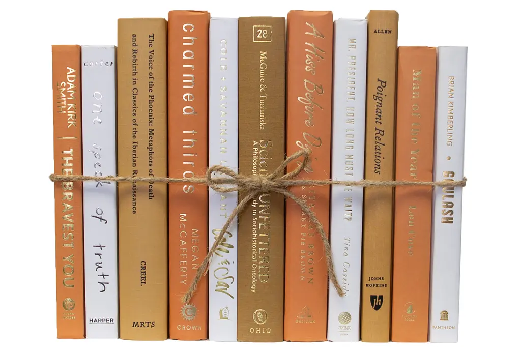 Transform your space with our Modern Rose: Color By The Foot. Order as many linear feet as you need to complete your project. Authentic modern hardback decorative books in soft shades of light burgundy. All books are published 1980-present and include a variety of fiction and non-fiction titles. Each linear foot contains 10-12 books with an average height of 8.5-9.5". Titles will differ from those pictured; jute string for photography purposes only.