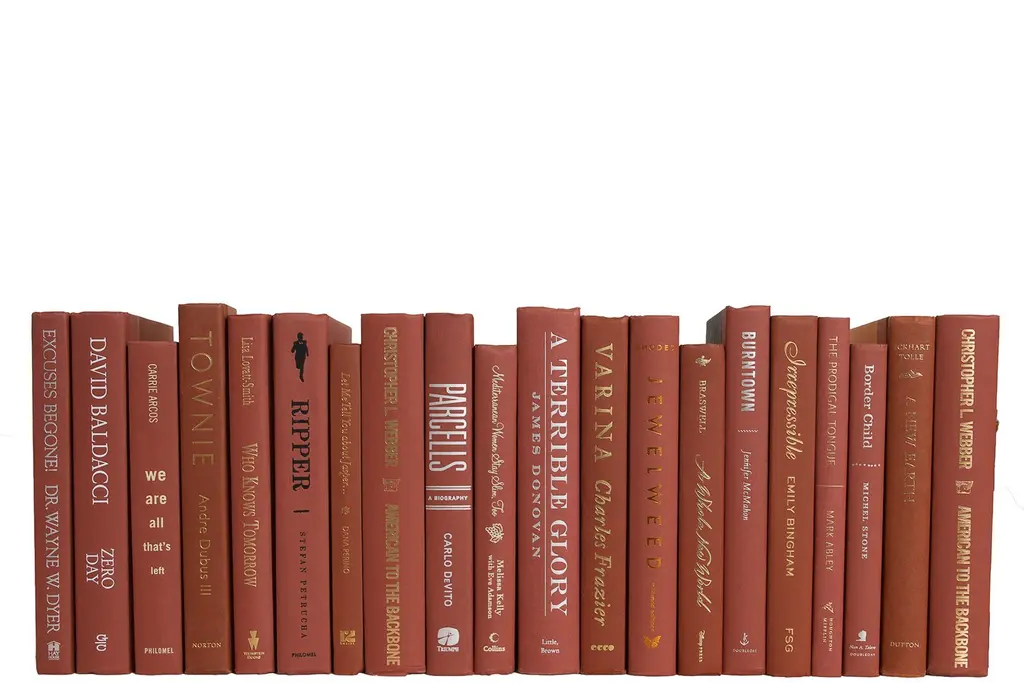 Transform your space with our Modern Sienna: Color By The Foot. Order as many linear feet as you need to complete your project. Authentic modern hardback decorative books in warm shades of reddish brown. All books are published 1980-present and include a variety of fiction and non-fiction titles. Each linear foot contains 10-12 books with an average height of 8.5-9.5". Titles will differ from those pictured.