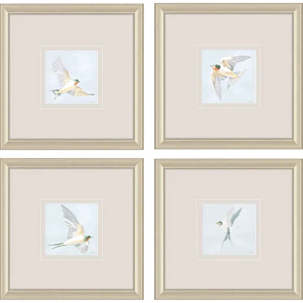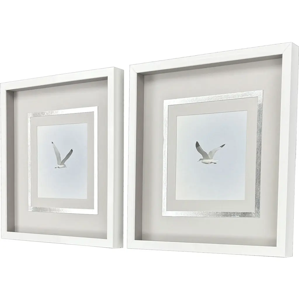 Graceful birds feature neutral matting with a hand applied silver leaf accent. Framed in a lacquered white wood shadow box style molding.