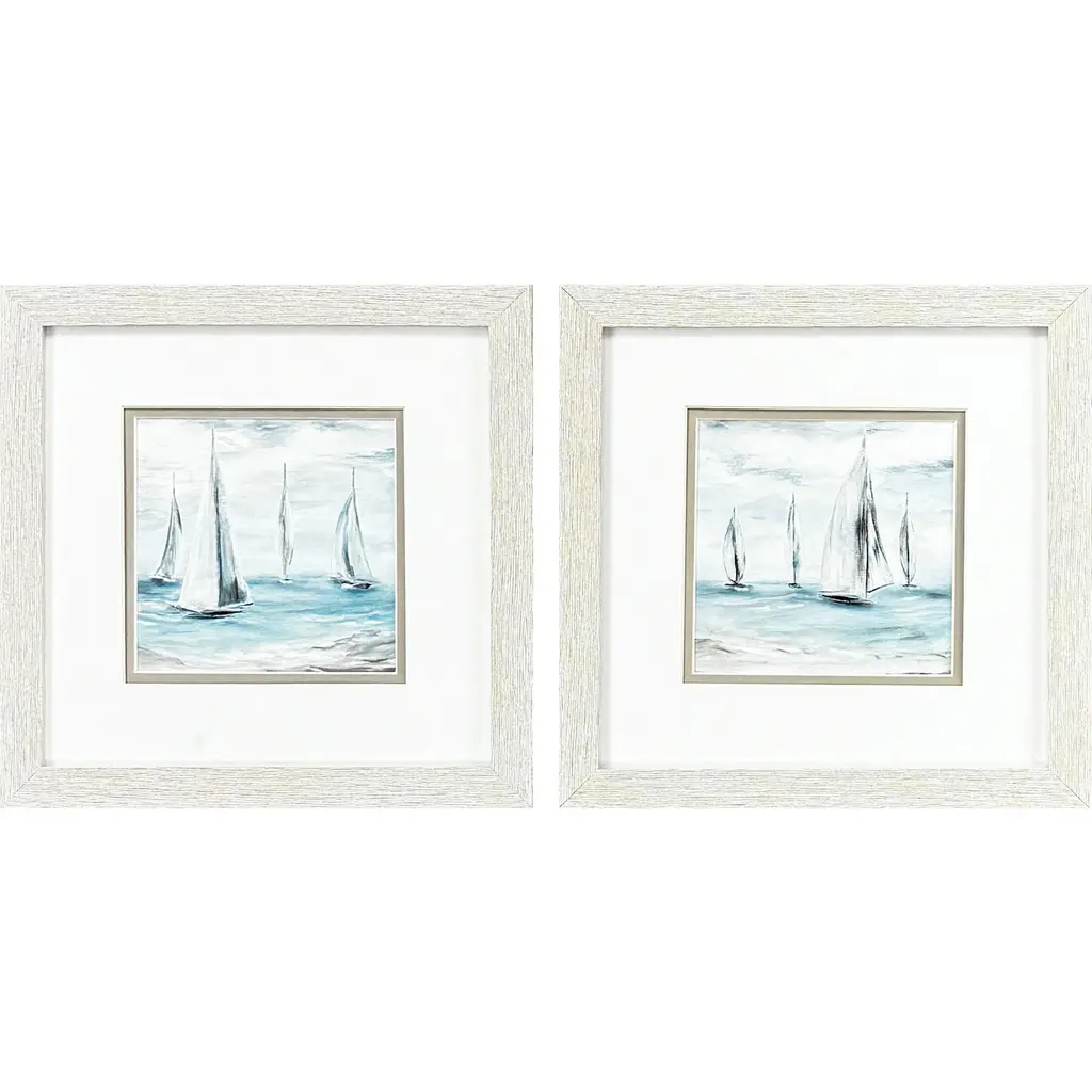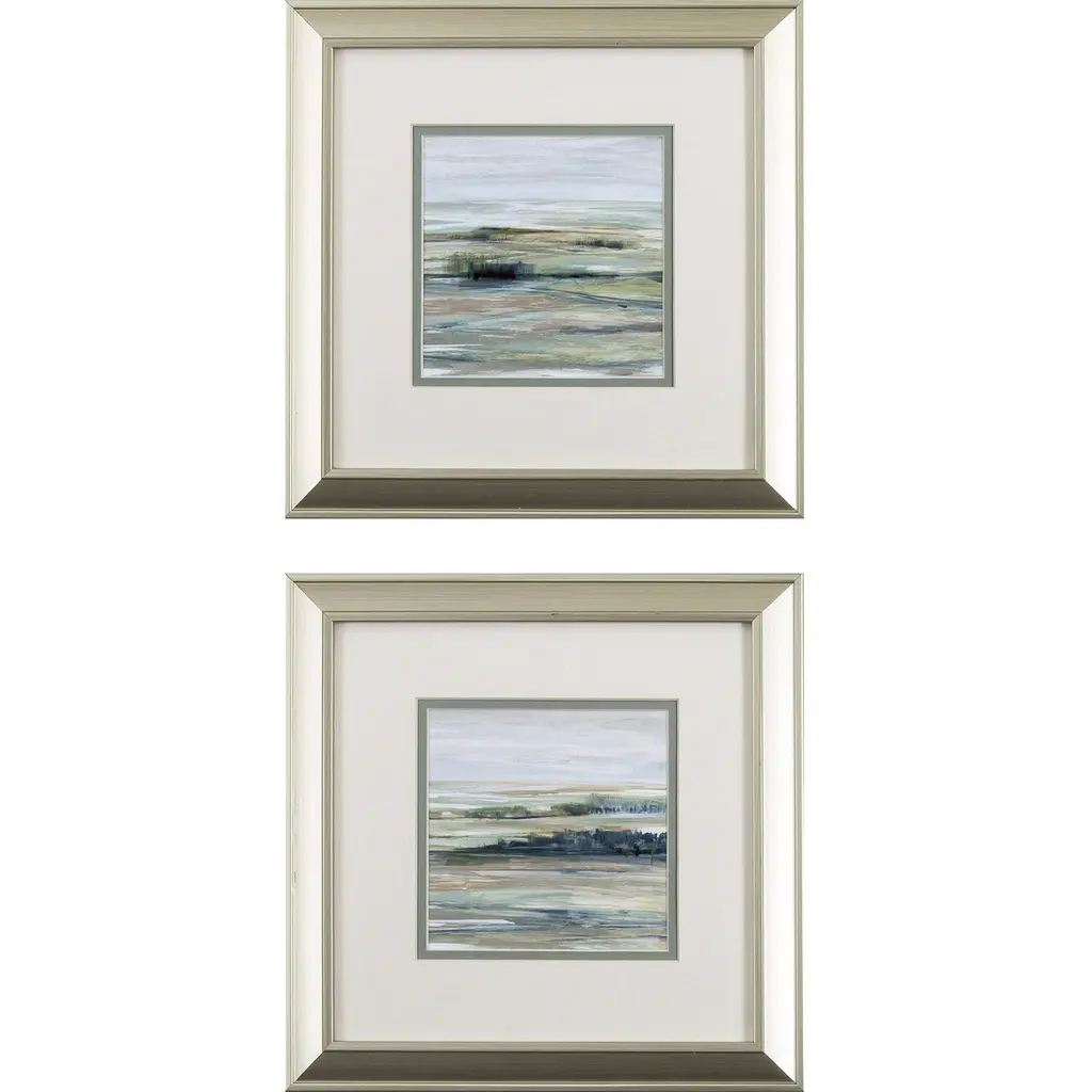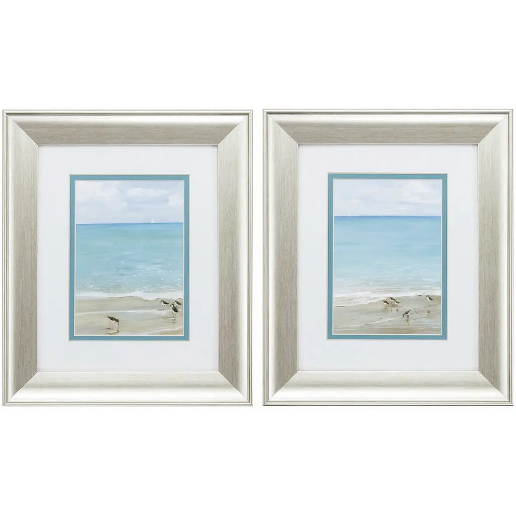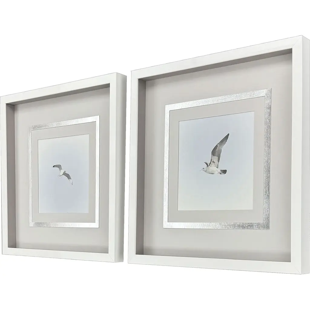 Graceful birds feature neutral matting with a hand applied silver leaf accent. Framed in a lacquered white wood shadow box style molding.