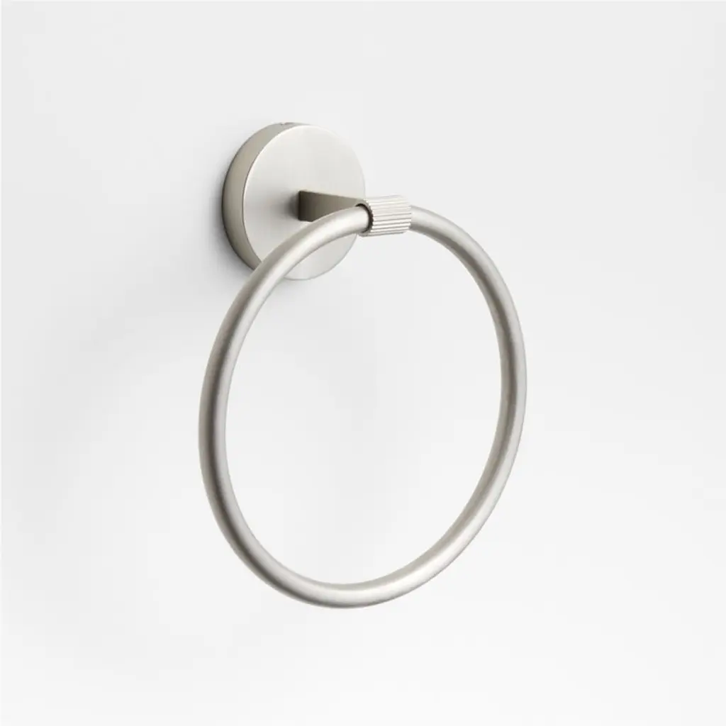 Sometimes it's the small things that pull a room together. That's why we've designed a hardware collection with modern silhouettes, clean lines and a touch of tradition to give your bathroom that perfect finishing touch. Made of brass and finished in brushed nickel, this towel ring lends industrial chic to its minimalist design. The towel holder threads a perfect circle through a fluted tube that extends from a flat bar anchored to a circular mount for an intriguing mix of rounded edges, smooth surfaces and texture. The hand towel ring easily fastens to the wall with included hardware.