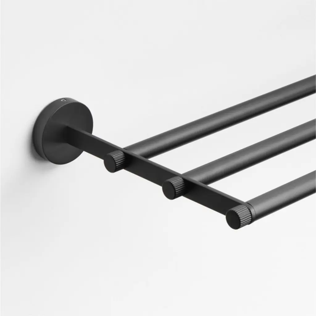 Sometimes it's the small things that pull a room together. That's why we've designed a hardware collection with modern silhouettes, clean lines and a touch of tradition to give your bathroom that perfect finishing touch. Made of brass and finished in matte black, this towel rack lends industrial chic to its minimalist design. Extending from flat bars anchored to circular mounts, the rack caps each of its three bars with fluted ends for a bit of texture. The wall-mounted towel rack installs easily with included hardware.