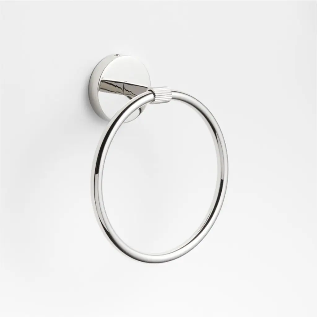 Sometimes it's the small things that pull a room together. That's why we've designed a hardware collection with modern silhouettes, clean lines and a touch of tradition to give your bathroom that perfect finishing touch. Made of brass and finished in shiny chrome, this towel ring lends industrial chic to its minimalist design. The towel holder threads a perfect circle through a fluted tube that extends from a flat bar anchored to a circular mount for an intriguing mix of rounded edges, smooth surfaces and texture. The hand towel ring easily fastens to the wall with included hardware.
