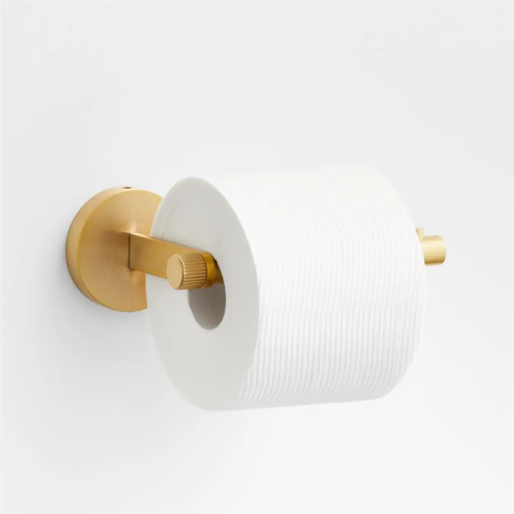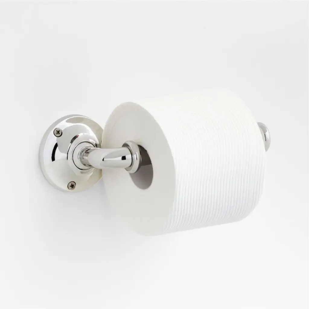 Sometimes it's the small things that pull a room together. That's why we've designed a hardware collection with modern silhouettes, clean lines and a touch of tradition to give your bathroom that perfect finishing touch. Made of brass and finished in polished chrome, this toilet paper holder lends industrial chic to its minimalist design. Extending from a flat bar anchored to a circular mount, the round bar is capped with a fluted end for a bit of texture. Open ended to facilitate paper roll changes, the wall-mounted holder installs easily with included hardware.