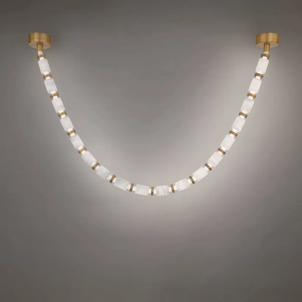 Timelessly tasteful. Cylinders of natural Spanish Alabaster and gleaming metallic collars ornament a silica strand, creating a gemlike presence.Features:Dimensions:Electrical Specifications: