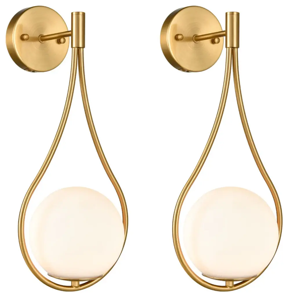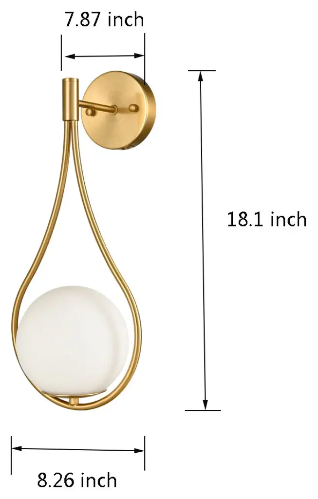 Set of two minimalist drop design wall light with opal globe glass in antique brass finish,be more fashionable,make your house look bright,tidy and spacious,add a lot of elegance.Diameter 8.26-inches, Height 18.1-inches, Back plate 4.7-inches,Lampshade Diameter 5.9-inches.ETL listed,hard-wired,1x 40W Max E26 bulbs(NOT included).TipsIf you need brighter light, please use a LED Corn Light Bulb.Suitable for living room,bedroom,stairs,cafe,library,shop,and so on.Material: metal,glassColor:antique brass,opal whiteBulb Base: E26Bulb Type: Incandescent, LED,CFLNumber of Bulbs: 1,diameter less than 1.8",height less than 3.62"(NOTE: Bulb NOT Included)Voltage:120VWattage: 40W