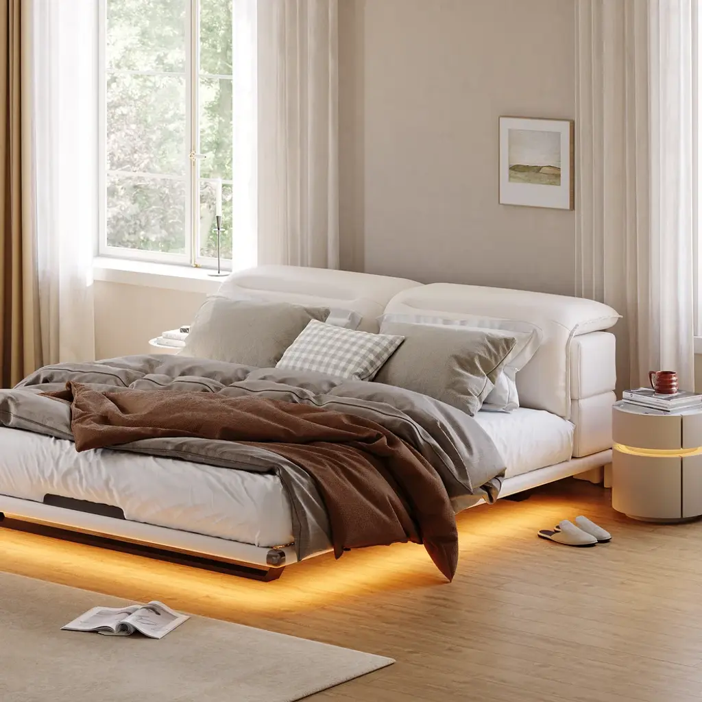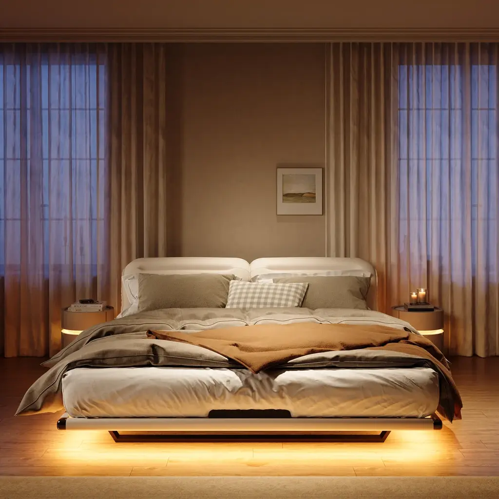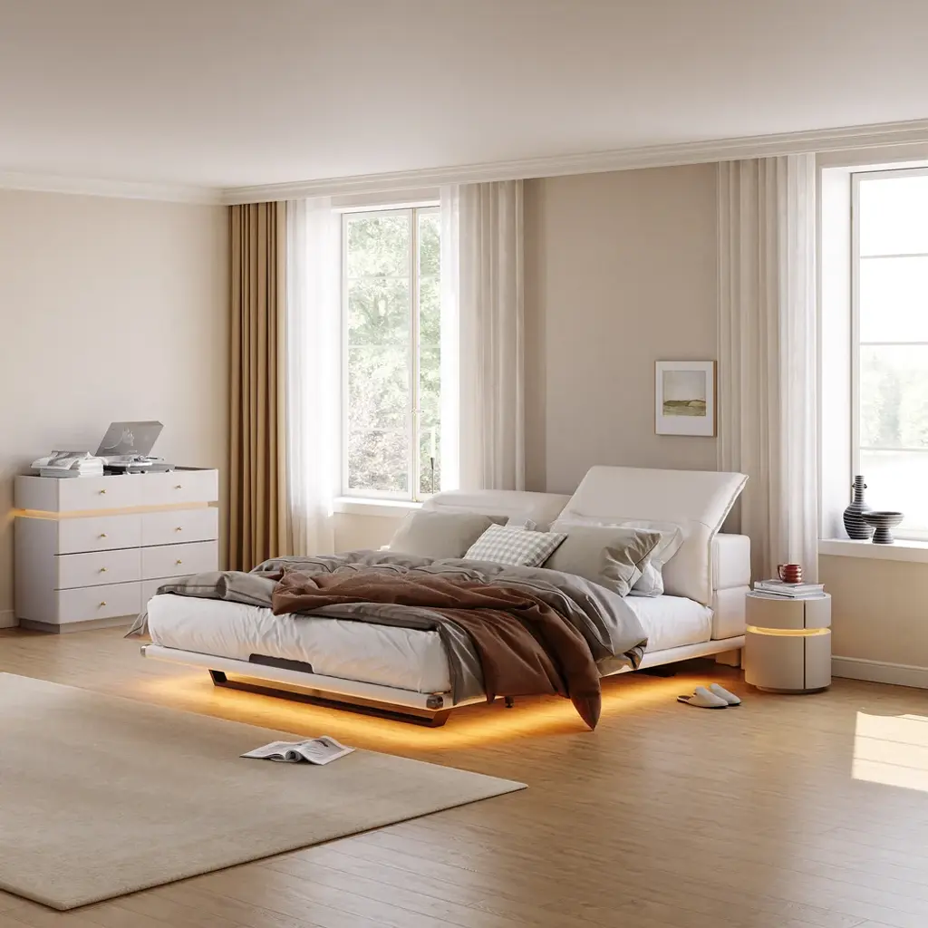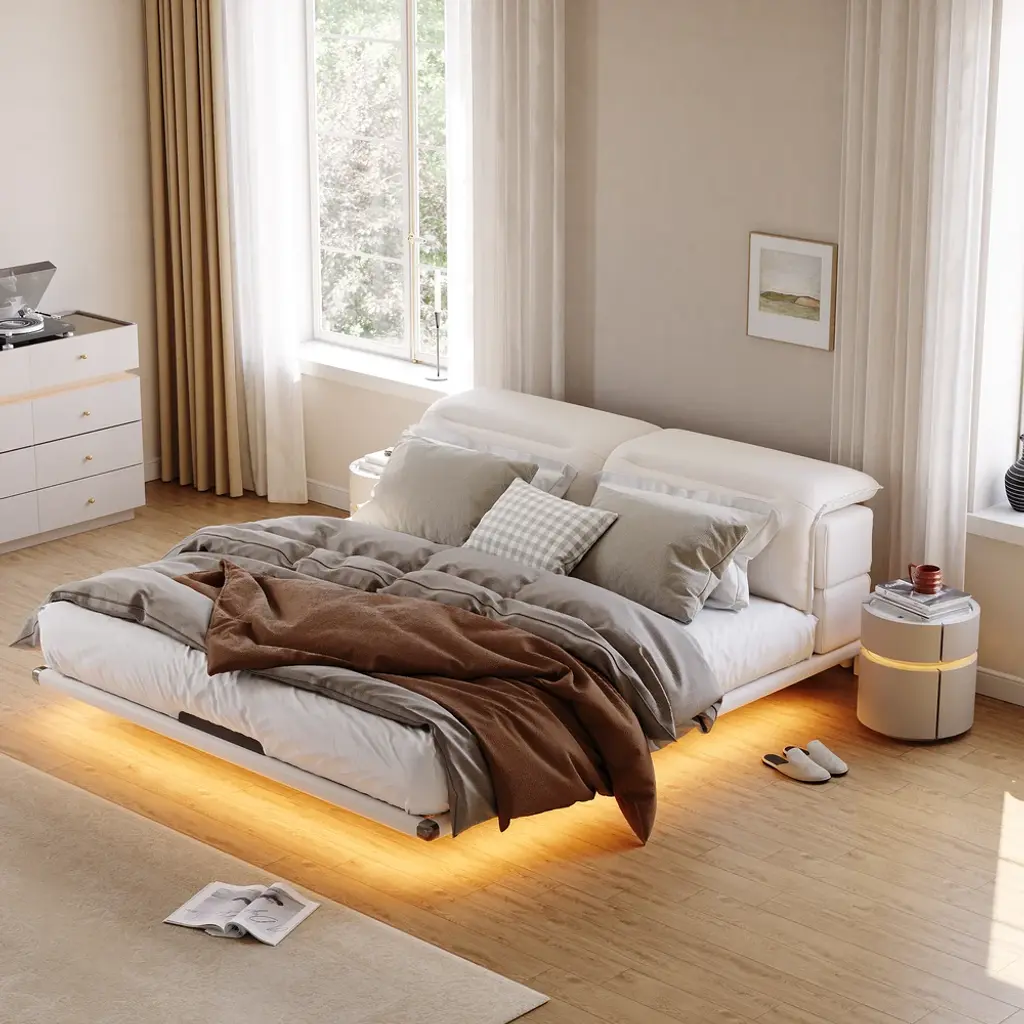 Elevate your bedroom with this leather floating bed. Motion-sensor LEDs, adjustable headrests, and sleek faux leather combine luxury, convenience, and modern style for the ultimate sleep experience.