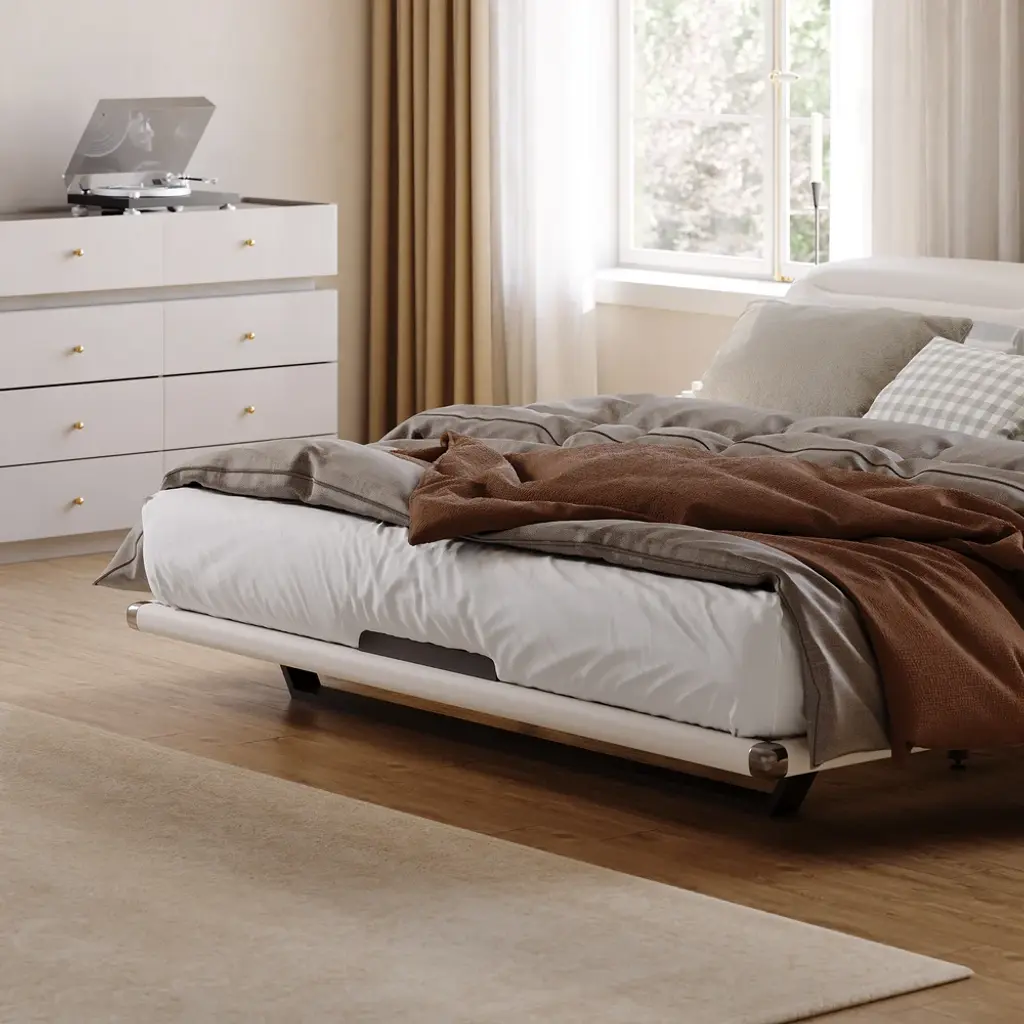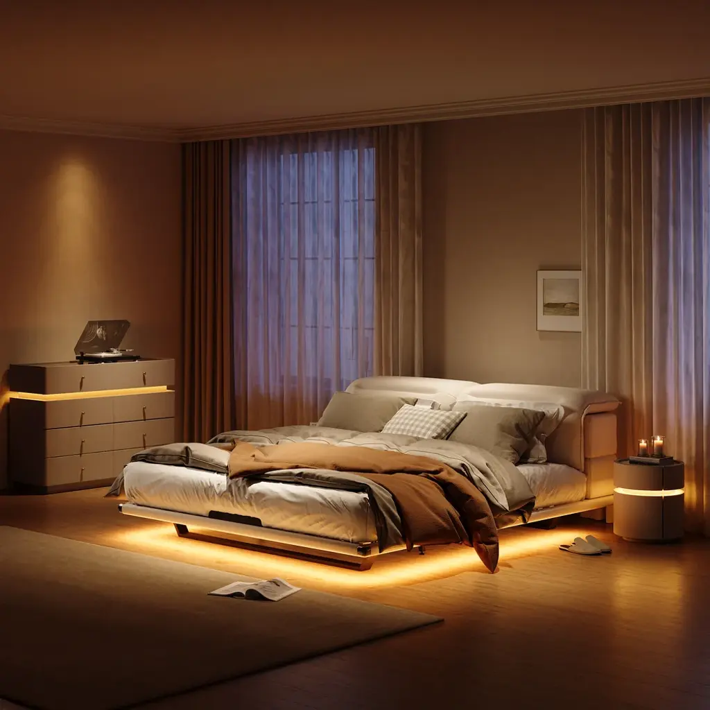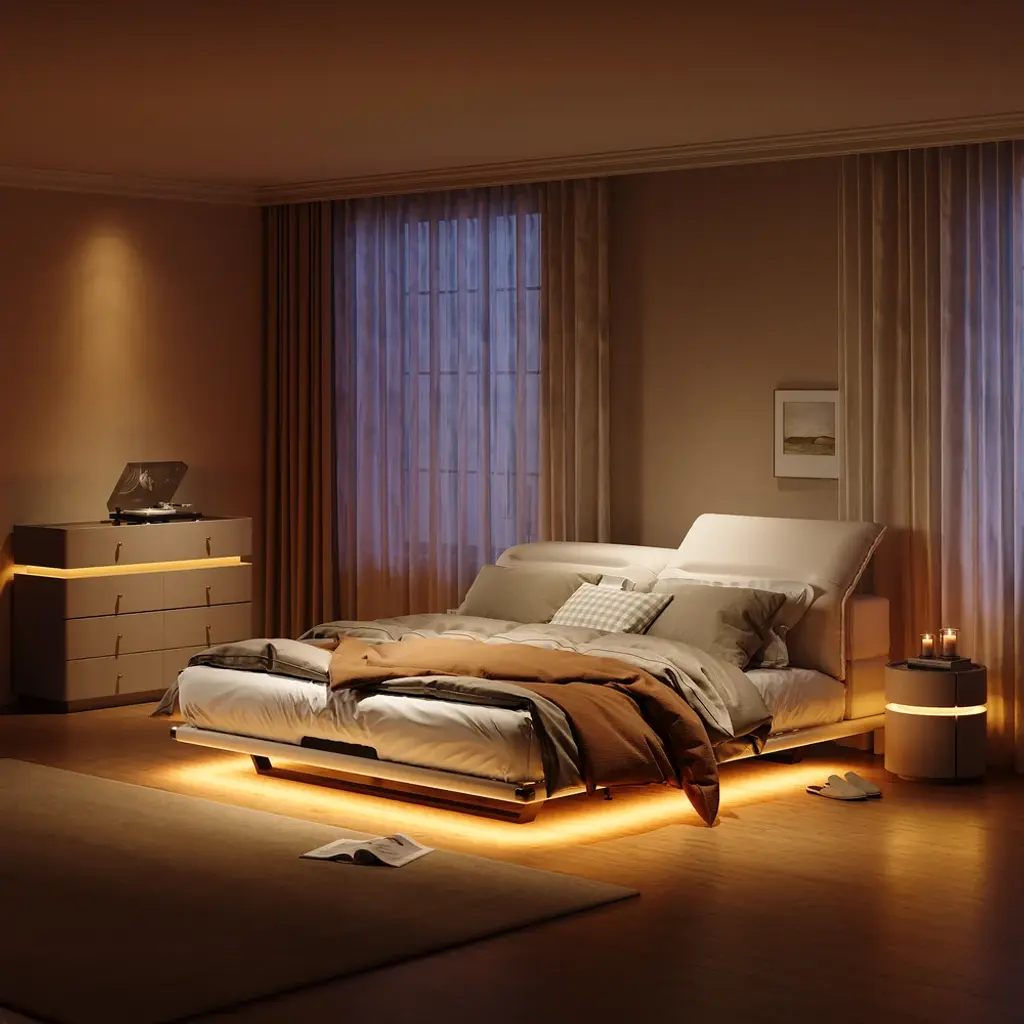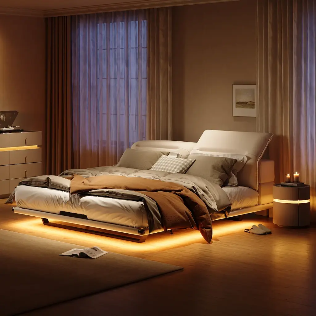 Elevate your bedroom with this leather floating bed. Motion-sensor LEDs, adjustable headrests, and sleek faux leather combine luxury, convenience, and modern style for the ultimate sleep experience.