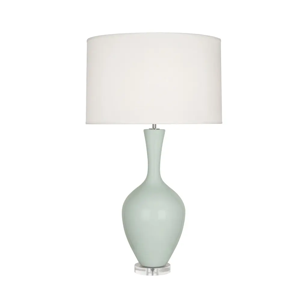 RICH SEAFOAM GREEN GLAZE ON A SOPHISTICATED, MODERN CERAMIC BASE. THIS LAMP MAKES A UNIQUE DESIGN STATEMENT.