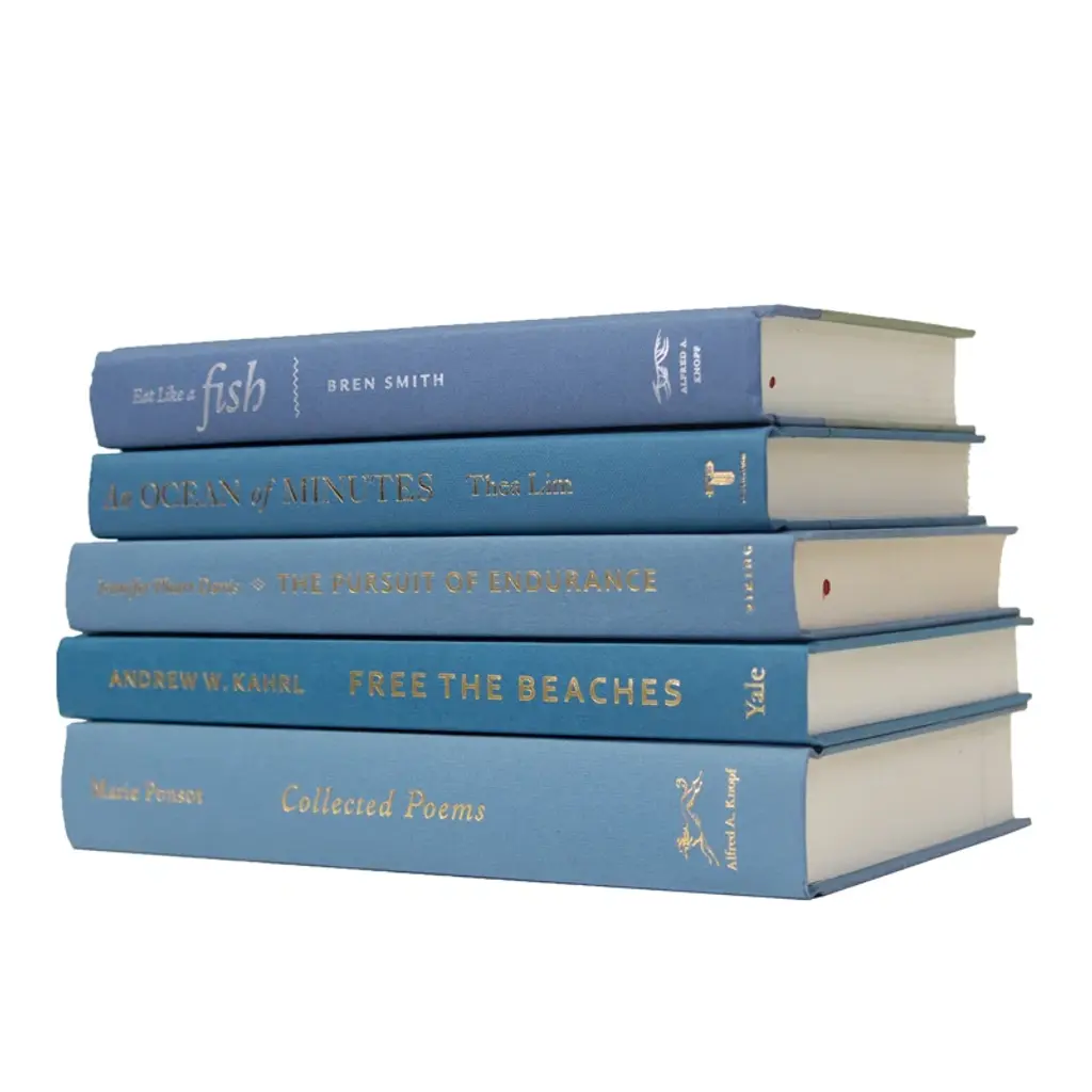 Modern Marlin Book Stack, S/5. Features a blend of five authentic hardback books published 1990-Present all displayed in a handsome pyramidal stack. The blended cool blue color tones make this Book Stack an inspired choice for any room. Enhance a coffee-table, side-table or bookshelf with these decorative books. Titles may differ slightly from those pictured but color pattern will remain the same.