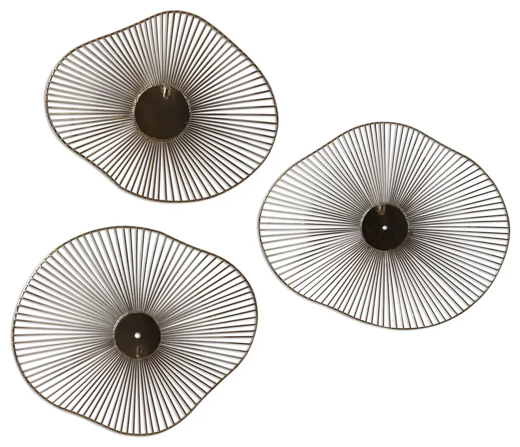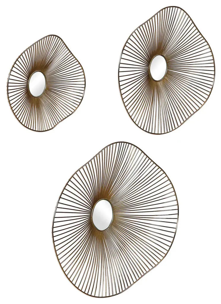 This Contemporary Set Of 3 Metal Wall Art Features 3-dimensional Organically Curved Shapes With Radiating Metal Spokes, Finished In A Plated Gold With Mirrored Center Accents. Sizes: Sm-16x13x2, Med-20x18x3, Lg-25x21x3• Includes three wall sculptures, one of each size: Sm-16x13x2, Med-20x18x3, Lg-25x21x3• Hand Finished Iron and Mirror Glass• Properly weighted hanging hardware attached.• Heirloom Quality - Expertly hand crafted and hand finished. Due to the hand crafted nature of this piece, each piece may have subtle differences.