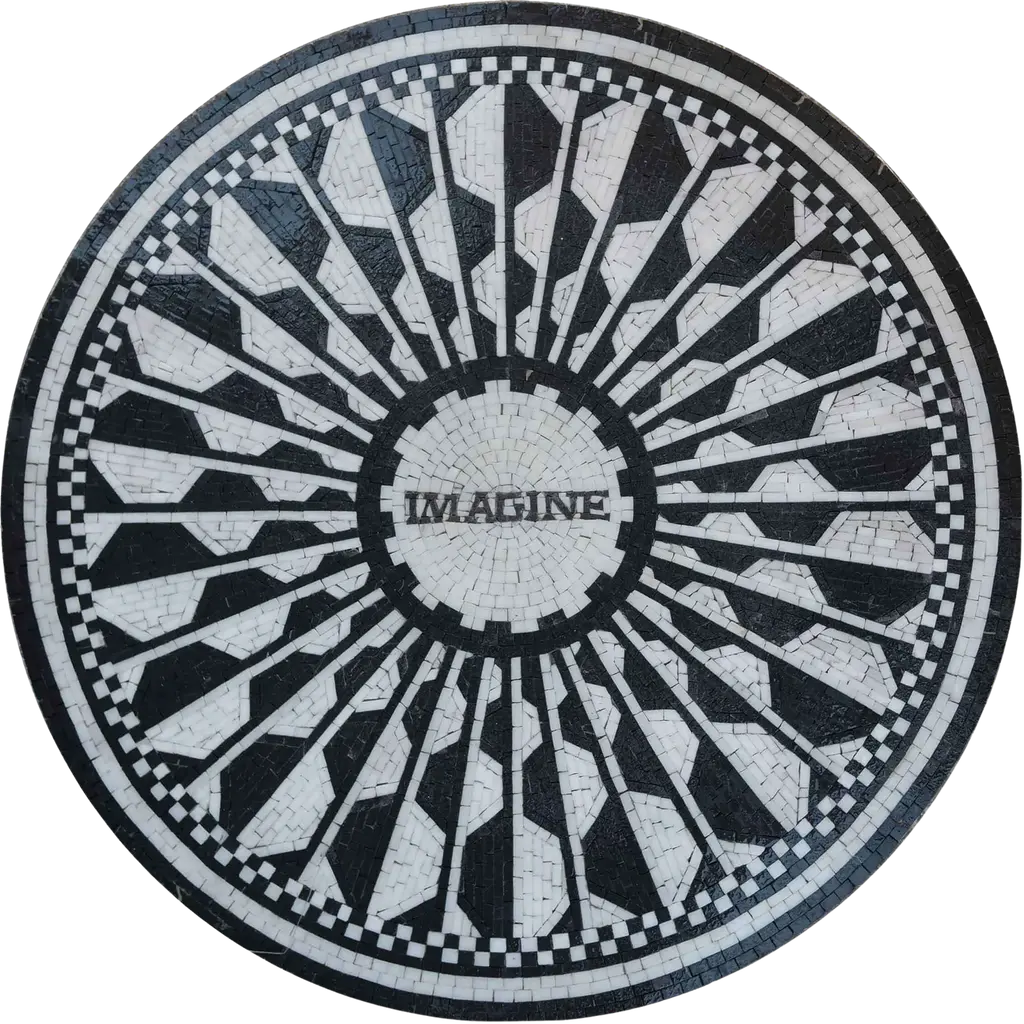 Set the scene for future dreams with our Imagine modern mosaic medallion. Made from natural stone hand-cut tiles in beige and black this mosaic can be used indoors on a table or wall or outdoors as a pool mosaic with a message.