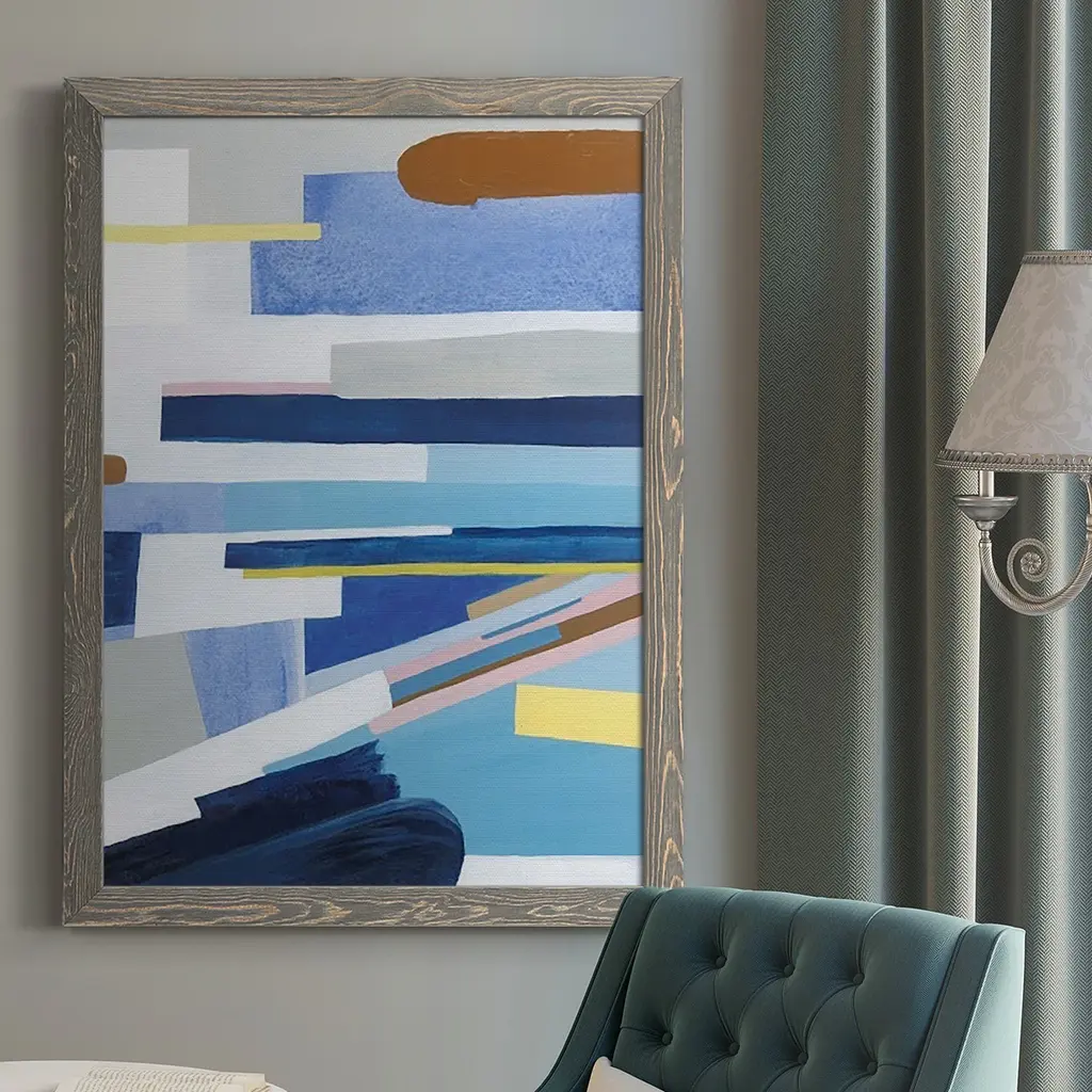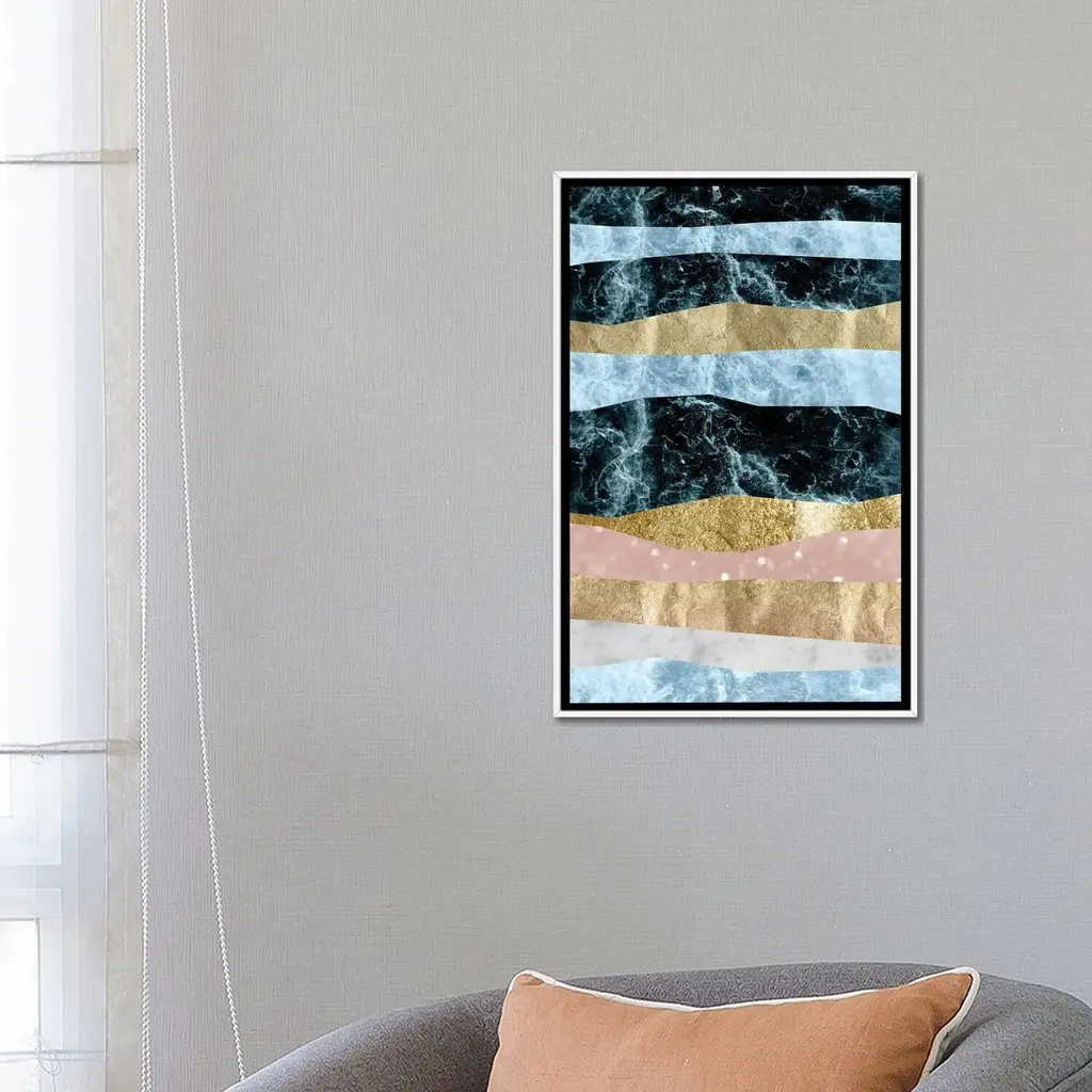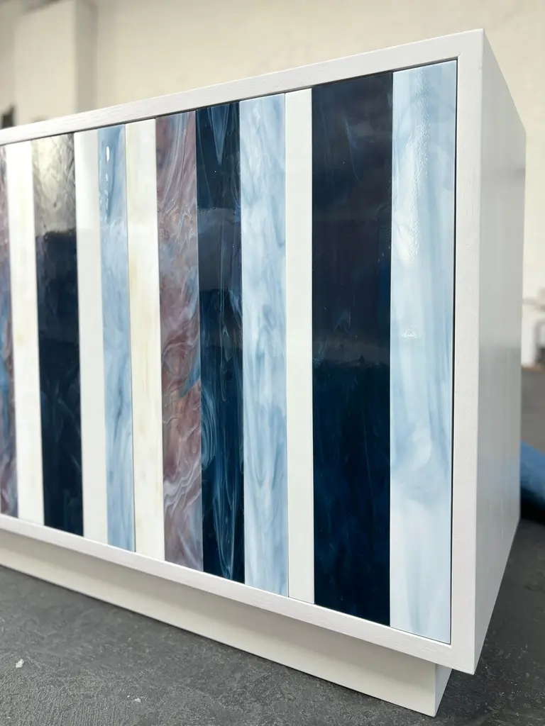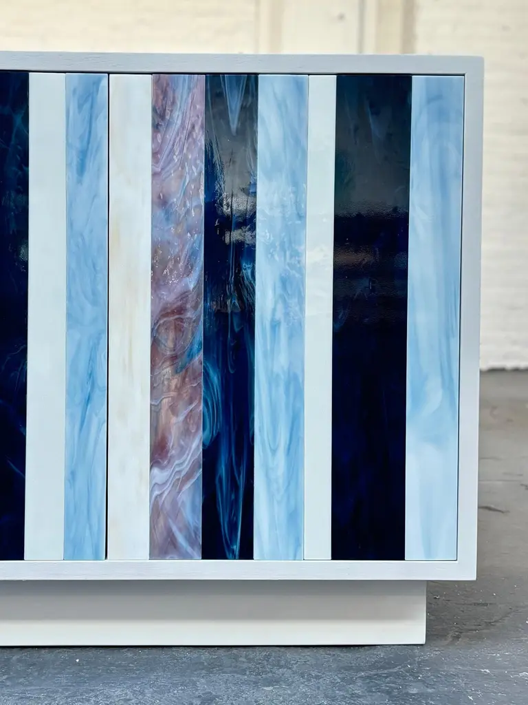 The Platform Linea buffet by Ercole home has a 4-door front, with White Wash finish on Oak. Handcut glass stripes in Ivory, French Blue, Electric Blue, and Notte decorate the surface of doors. There is a 4" platform base, one adjustable interior shelf in each compartment, and doors with touch latches. Custom sizes and finishes are available. You can add drawers and compartments in varying sizes to the interior as well. Made in New York City.