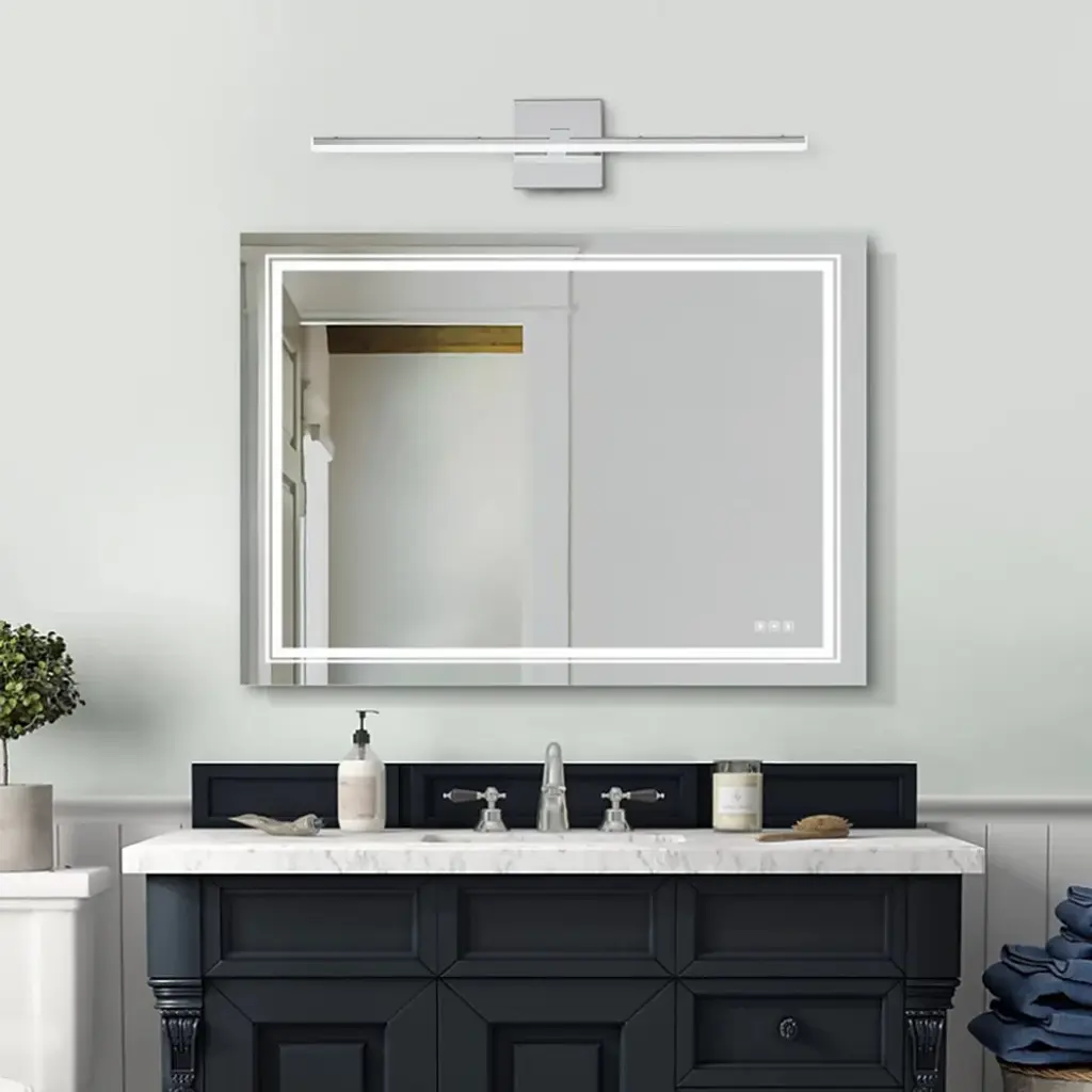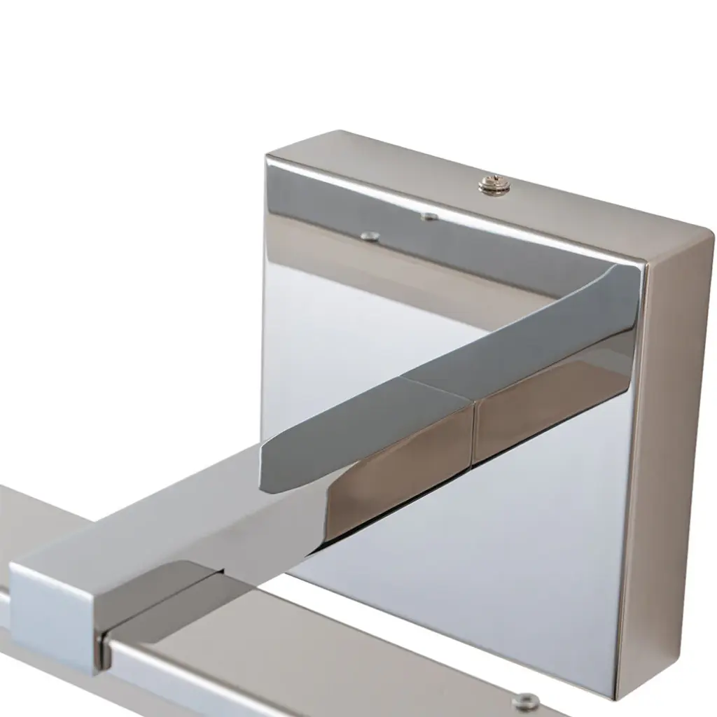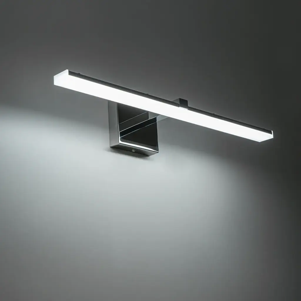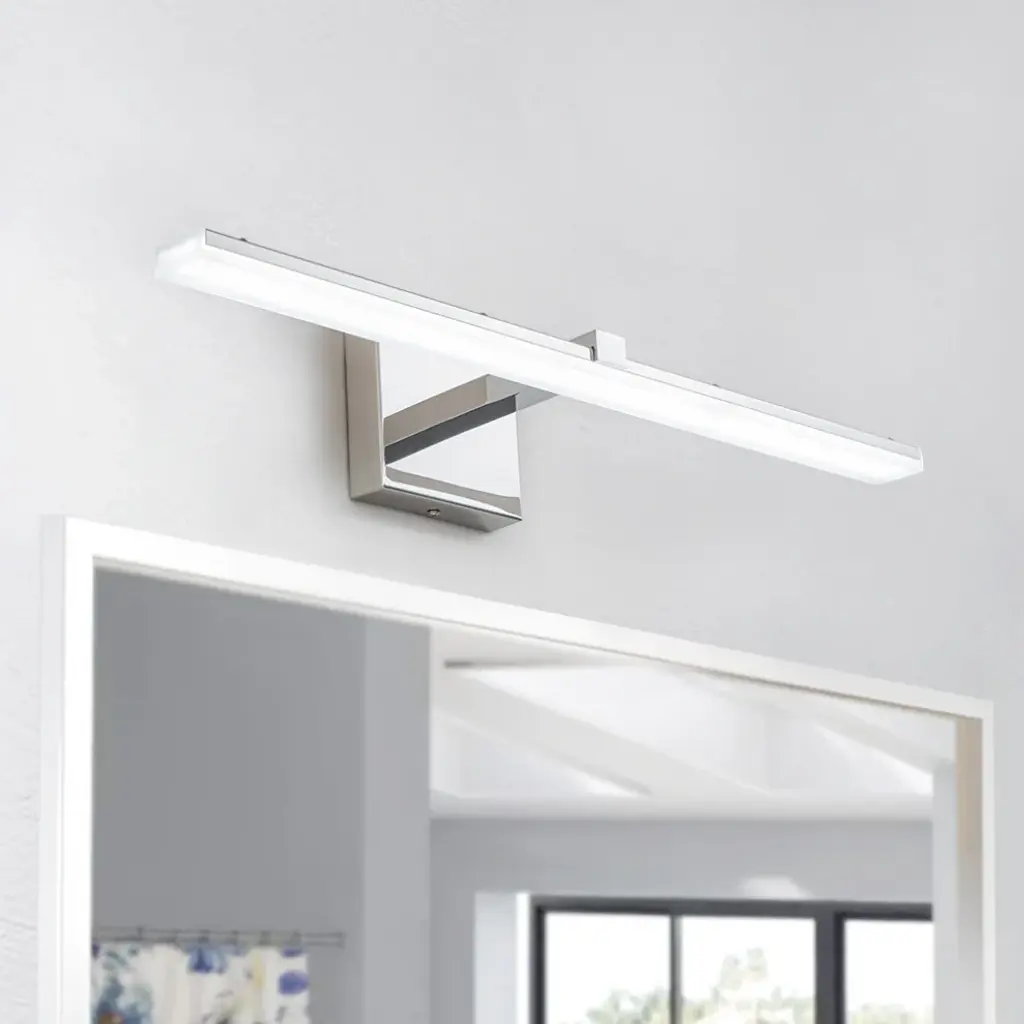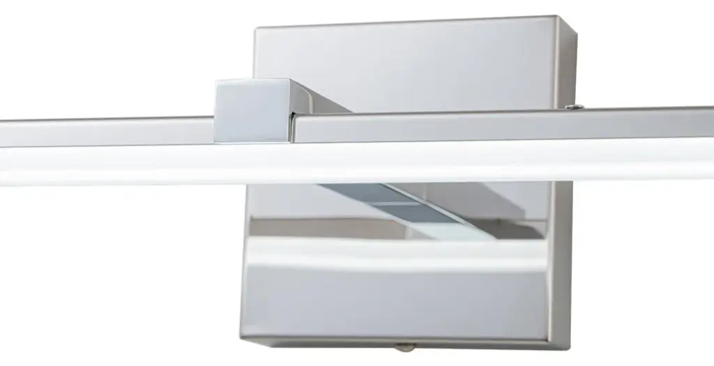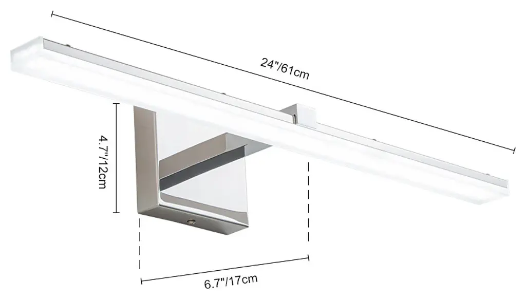 Upgrade your vanity bathroom with the modern look of this linear vanity wall sconce. This linear vanity light fixture features a polished chrome finish back panel and energy efficient LED modules placed within the design to provide energy efficient lighting. This simple linear LED wall sconce is sure to add a stylish touch to your bathroom. The light can also be dimmed to suit your needs, adding eye-catching visual appeal to your bathroom.Modern simple polished chrome LED vanity wall sconce.24" width, 6.7" depth.LED light color temperature 6000K.US standard 110V, 18W.Polished chrome finish back panel, 4.7" width.Can be installed vertically or horizontally.