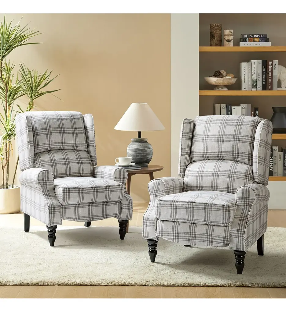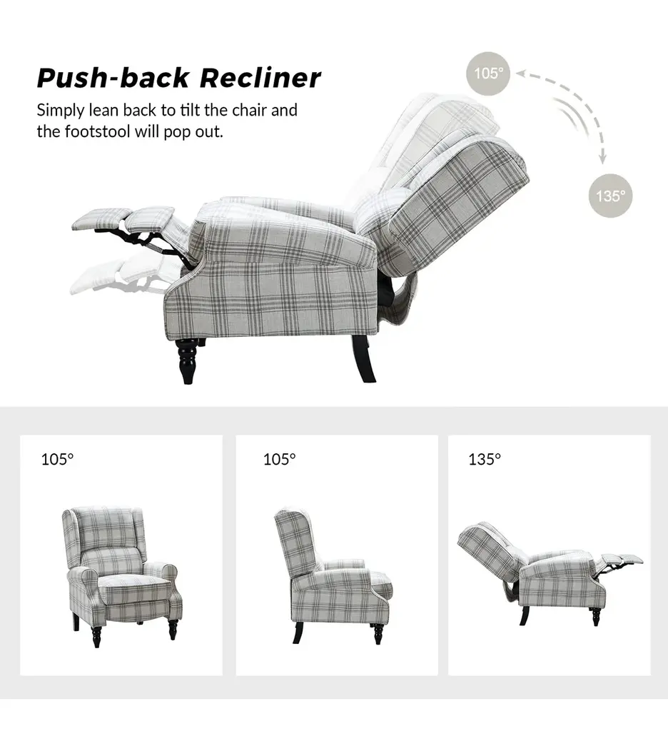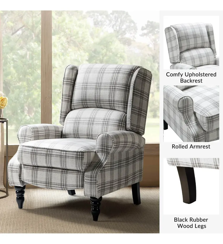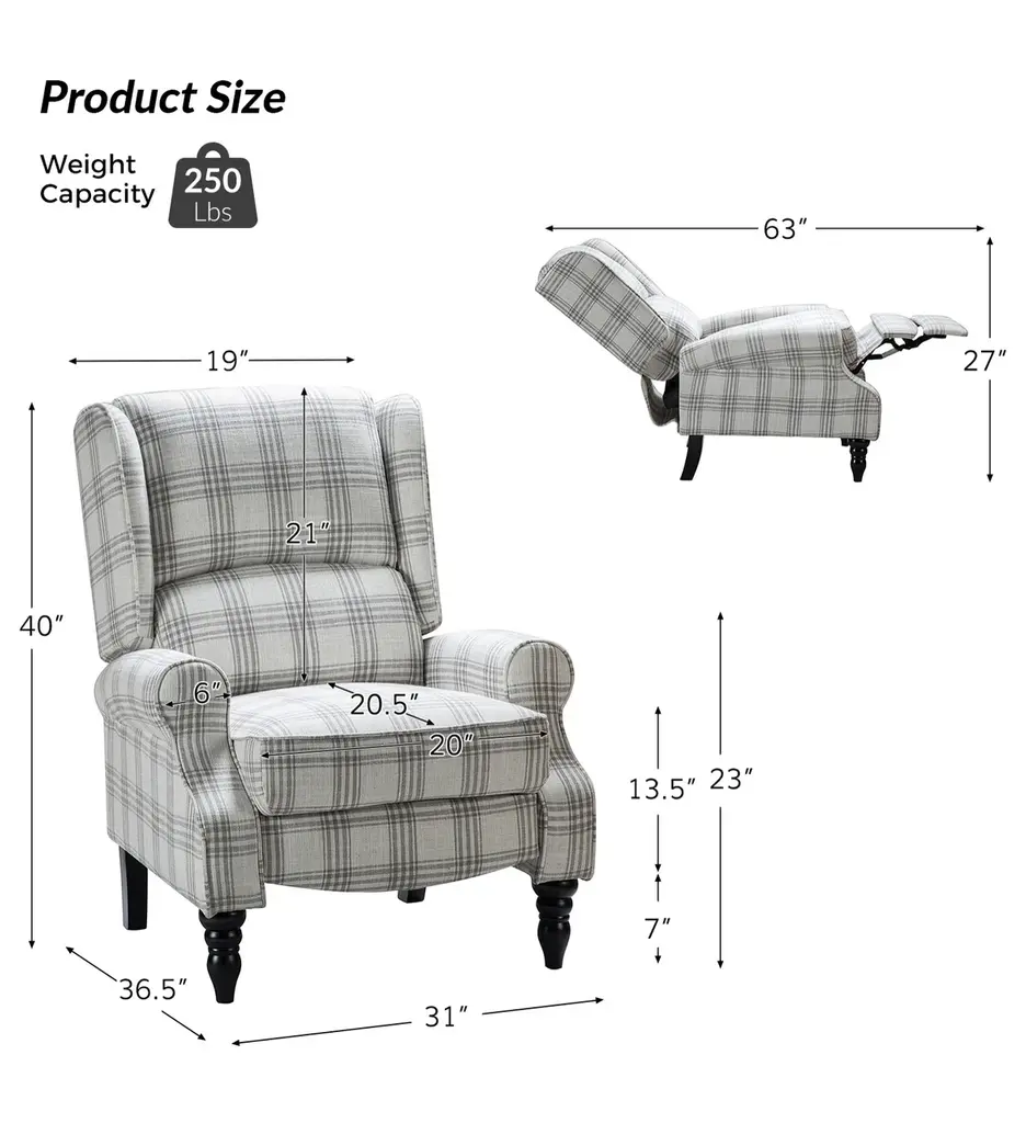 When it comes to elevating your living room look or accenting the master suite, this modern wingback recliner is the perfect spot to unwind. This chair with two cushions padded backrest and a foam-filled frame exudes ease and comfort when both upright and in the reclining position, while the built-in pocket spring and sinuous spring provide excellent support capacity. Crafted from solid and manufactured wood while offering several different fabric choices, this textured manual-adjusted recliner shows a modern appearance for simple yet fashionable charm in any living room. With optional patterns and creative colors that meet your demands, its retro-carved rubber legs bring you endless reverie. Simply recline the back with the hidden footrest, it helps to relax your joints after a long day of work, perfect for living room, media, and master bedrooms.Product Including: One wingback recliner, assembly required.Contemporary Classic Style: Upholstered in foam and textured fabric, the wingback recliner with cushions and padded backrest provides a comfortable space, suitable for all kinds of living room decoration.Durable and Stable Frame: Sturdy solid and manufactured wood frame with pocket spring brings perfect support. It is ideal for reading a good book or enjoying an afternoon nap.Design: Decorated with optional fancy patterns and colors, this piece with black rubber wooden legs adds a chic flair to your workspace and also features a refined stitching detail along the edges to bring character and elegance to any office.Safety Reminder: Due to the design of the process, all recliners will have a small gap between the left and right sides of the back and the seat cushion. For safety reasons, please pay special attention to the use of children at home to prevent pinching.Product DetailsWeight Capacity:250lb.Level of Assembly: Partial AssemblyFrame Material: Solid and Manufactured WoodBack Fill Material: FoamSeat Fill Material: Foam and Polypropylene CottonWeights & DimensionsItem Size:31"Wx36.5"Dx40"HSeat Size:20"Wx20.5"Dx20.5"HBack height to seat:21Required Back Clearance to Recline:16Item weight:62.83SpecificationsUpholstered: YesArms Included: YesOttoman Included: NoLeg Color: BlackPillows Included: NoLeg Material: Rubber WoodInstructions:Because the size of the product is measured manually, there may be errors.Country of Origin: China