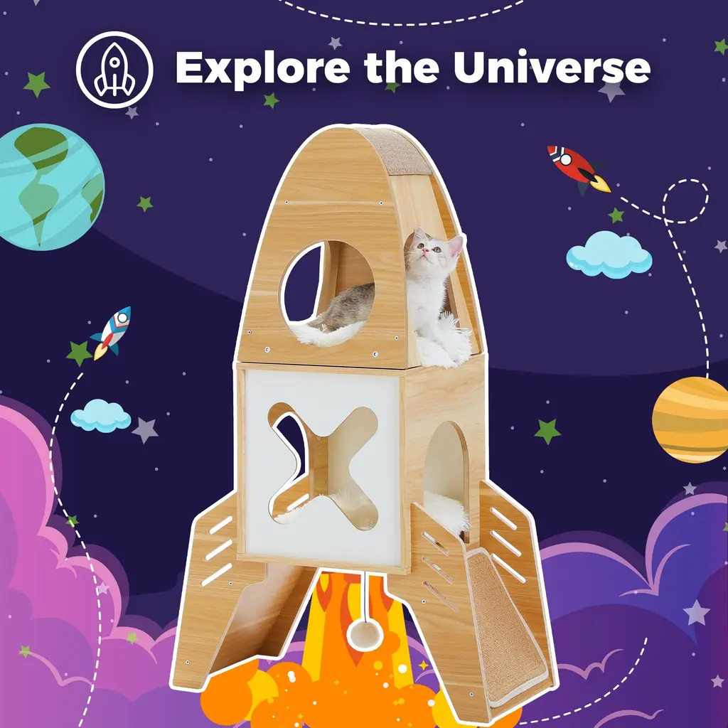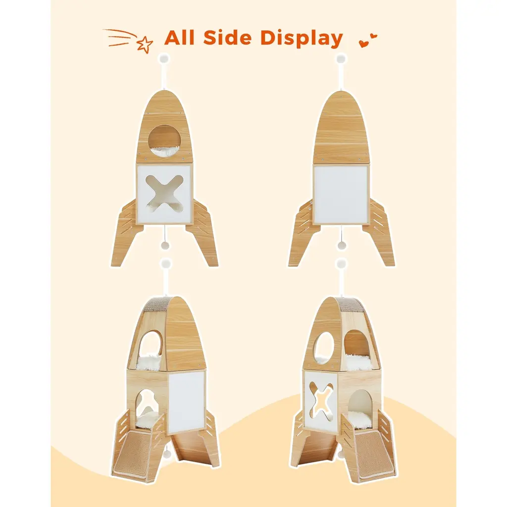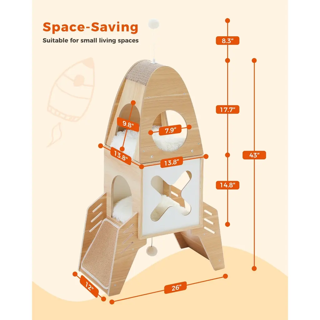 Modern Rocket Shape Multi-Level Cat Tree With Condos & Dangling Balls - Beige-43"h