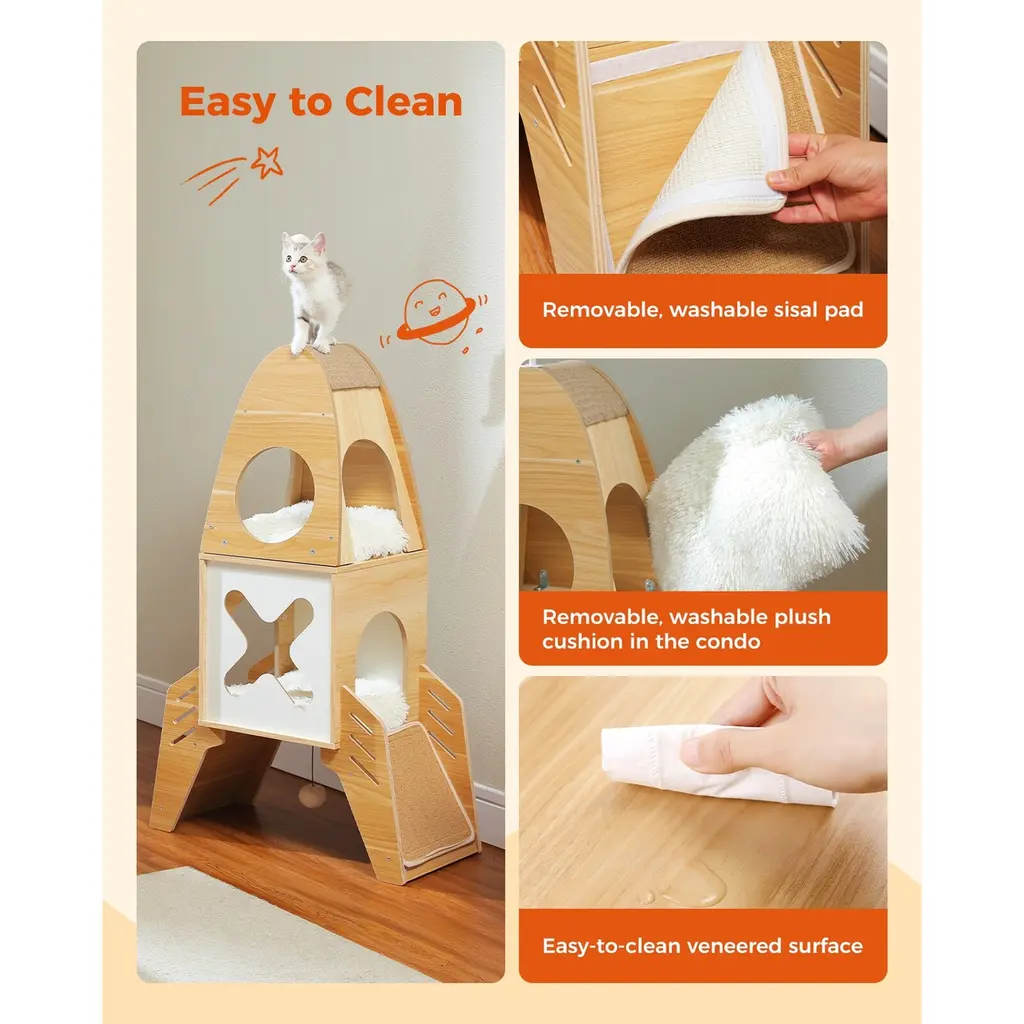 Spacious Apartment: This design with spacious condos is perfect for cat owners with more than one feline friend. The ultra-soft plush cushion on the ground floor provides ultimate comfort for cuddling, the second floor with cute hideaway holes offers a comfy ground for playing hide and seek. The super large shipping space with an acrylic porthole allows you to observe your cats' amusing activities, and the top loft is perfect for food, supplies storage, or enjoying outside views.Easy to Clean: We designed all the pads of this modern wood cat tree to be removable and washable, making a clean and healthy living environment for cats. In addition, the waterproof wooden surface greatly simplifies the cleaning process, ensures a long service life.Saffety & Stability: Thick and environmental-friendly CARB-certified particle boards, landing airfoils and reasonable structure build up this solid tower. It could support your cat family's daily activities securely.