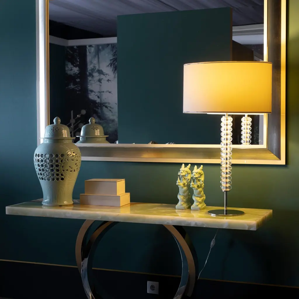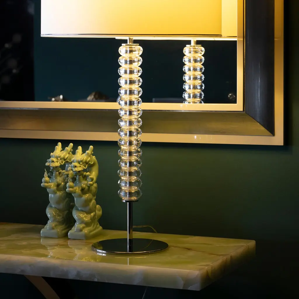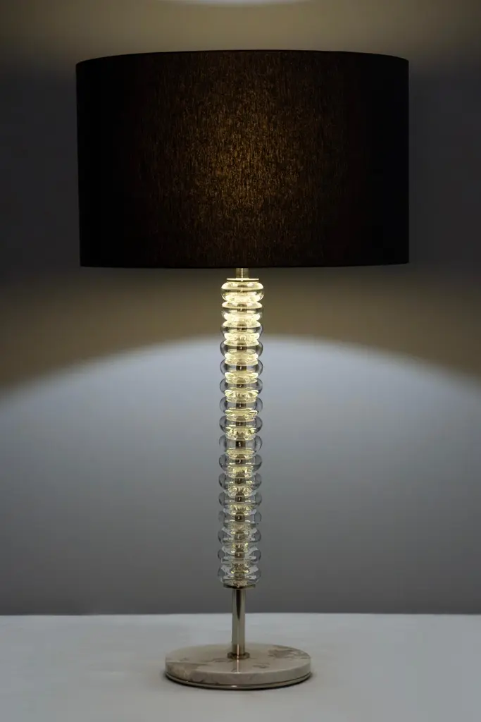 Saldanha Table Lamp, Modern Collection, Handcrafted in Portugal - Europe by GF Modern.A luxurious table lamp, Saldanha creates the subliminal ambiance for exceptional living. The clear-glass spheres harmonize the wonderful contrast between the polished champagne stainless steel metal stem, the Patagonia Granite base and the black lampshade.Table Lamp material codesME043 Polished stainless steel; champagne colour; ST069 Patagonia granite cream/ white colour; polishedM103852 Black satin fabricE27 LED lampHandcrafted in Portugal - Europe by GreenappleUnique by design, Crafted by peopleGreenapple transforms contemporary spaces into exclusive narratives of design and craftsmanship. From custom-made furniture to bespoke interiors, each creation is a timeless work of art, shaped by master artisans who honor centuries-old techniques.Founded in 2005 by Sérgio Rebola and Rute Martins, Greenapple has earned global recognition among high-end clientele and leading design firms. While Rute designs each unique piece, Sérgio ensures uncompromising quality from design to production and from production to your home. We provide a seamless experience, offering short production lead times, worldwide delivery within 7 to 10 days, and white-glove service upon request.For U.S. clients, we can handle customs clearance, and offer white-glove service as well upon request.Table Lamp