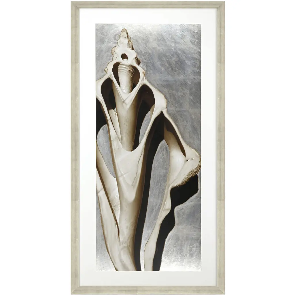 Exclusive hand embellished giclee with silver leaf. Framed in a modern antique silver leaf wood with champagne wash and black painted edge.