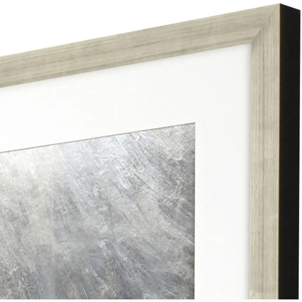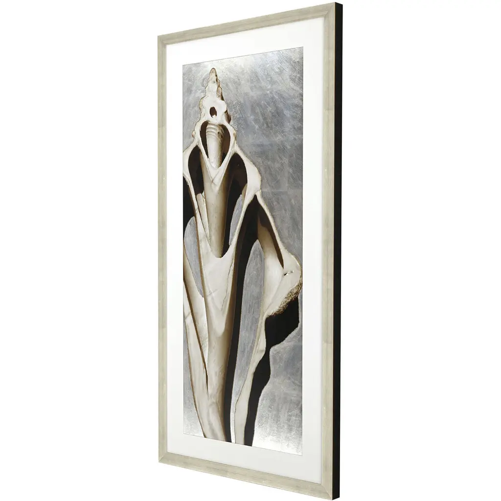 Exclusive hand embellished giclee with silver leaf. Framed in a modern antique silver leaf wood with champagne wash and black painted edge.