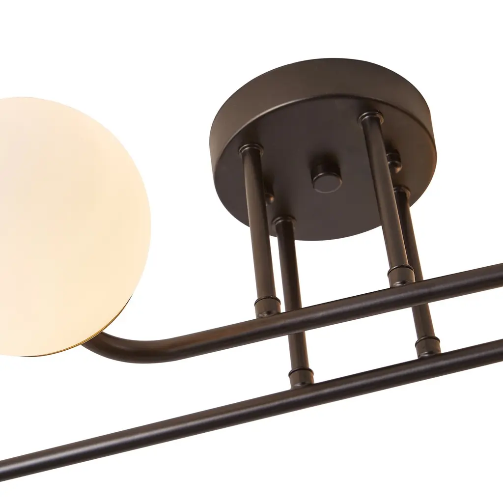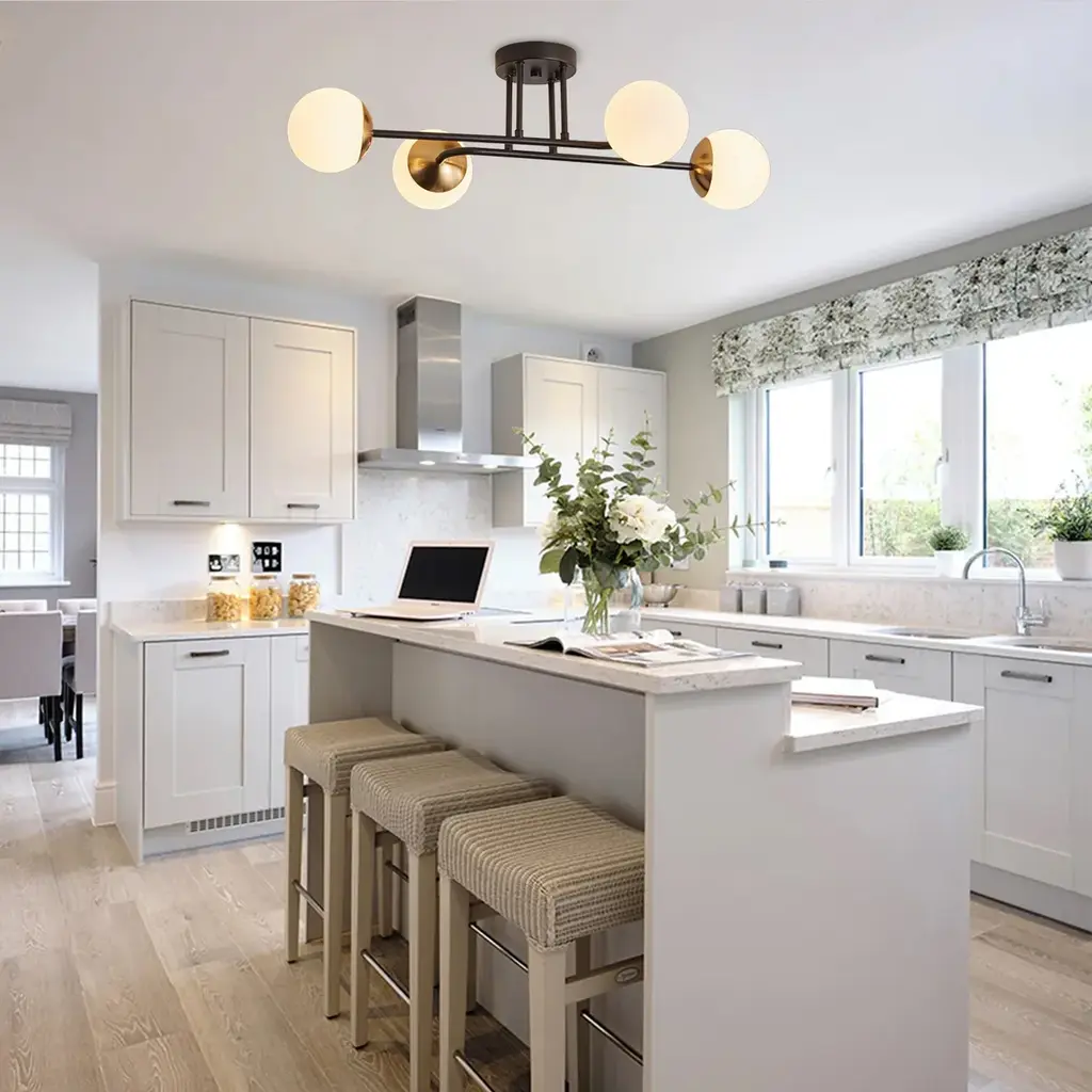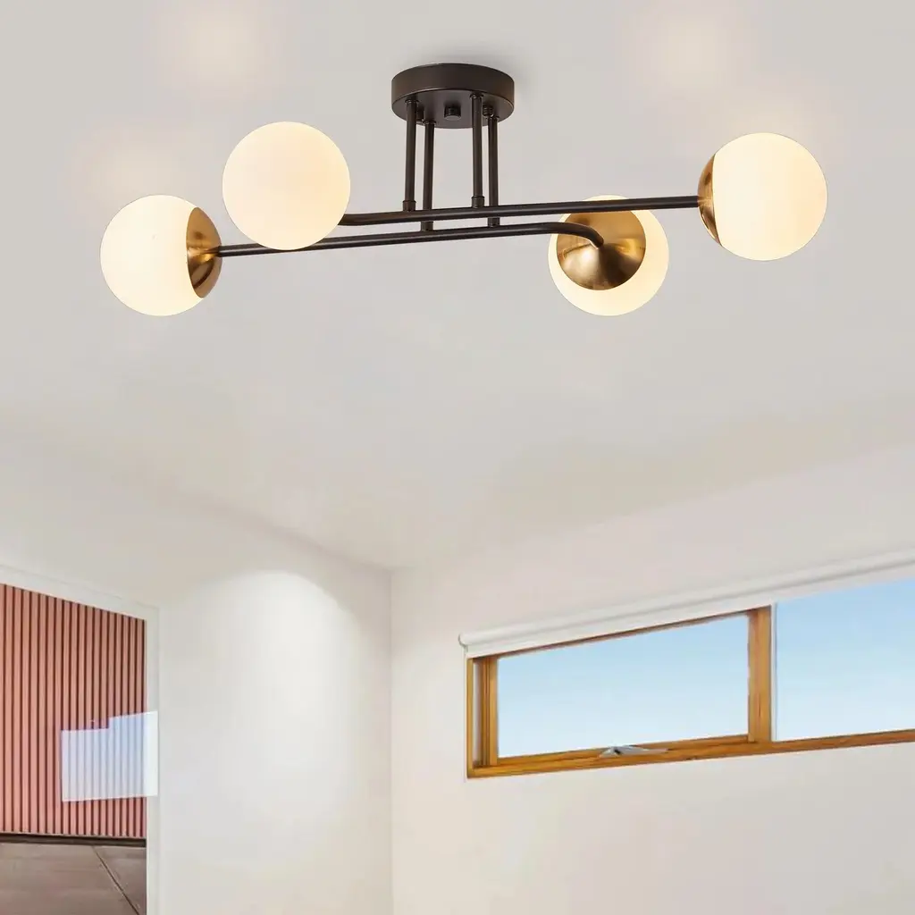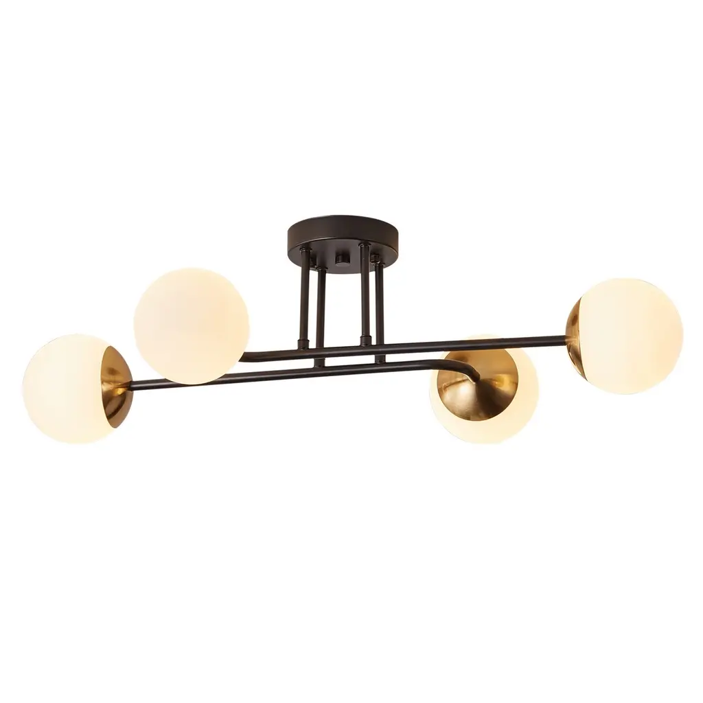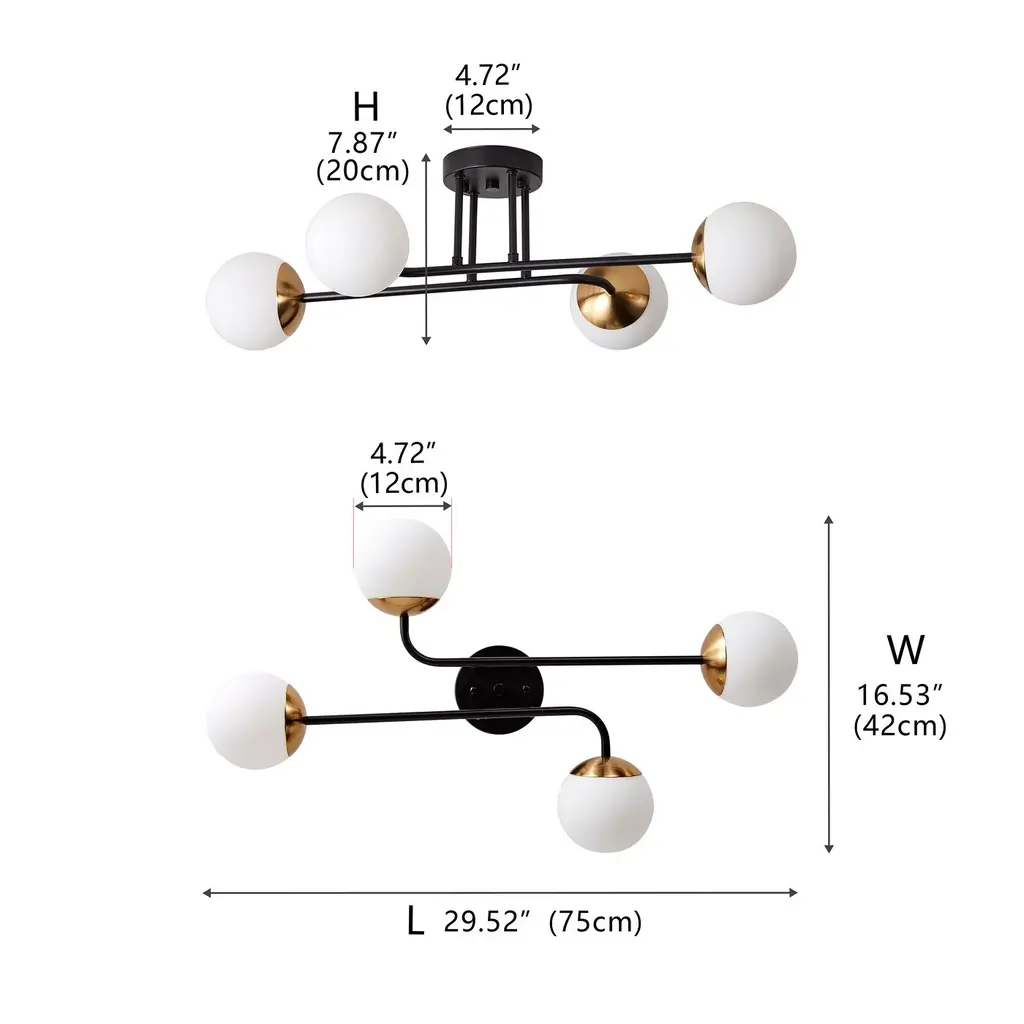 Specifications: Modern Style: The semi-flush mount ceiling light is made of metal and white glass shade, bringing attractive vintage retro and elegant charm, it meets all the needs of different spaces.Quality Assurance: High-quality iron and glass craft with painted finish. All products in the factory have to undergo rigorous safety monitoring, to ensure quality and safety.Easy to install: Don't worry about the installation difficulty, we will attach the installation instructions to you, with clear installation instructions, the operation can be completed quickly.Variety of Choices: Provide the most abundant categories of lighting products, to meet your needs. Our main products include LED Chandeliers, Pendant lights, Flush mount lights, Crystal Ceiling lamps, and island lights.Application: The modern black ceiling light is perfect for the kitchen, farmhouse, dining room, coffee bar, bedroom, living room, and hallway.