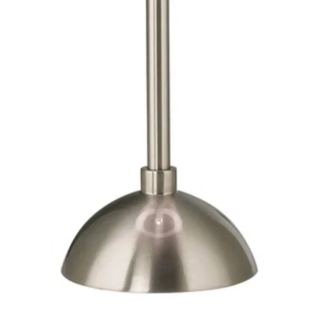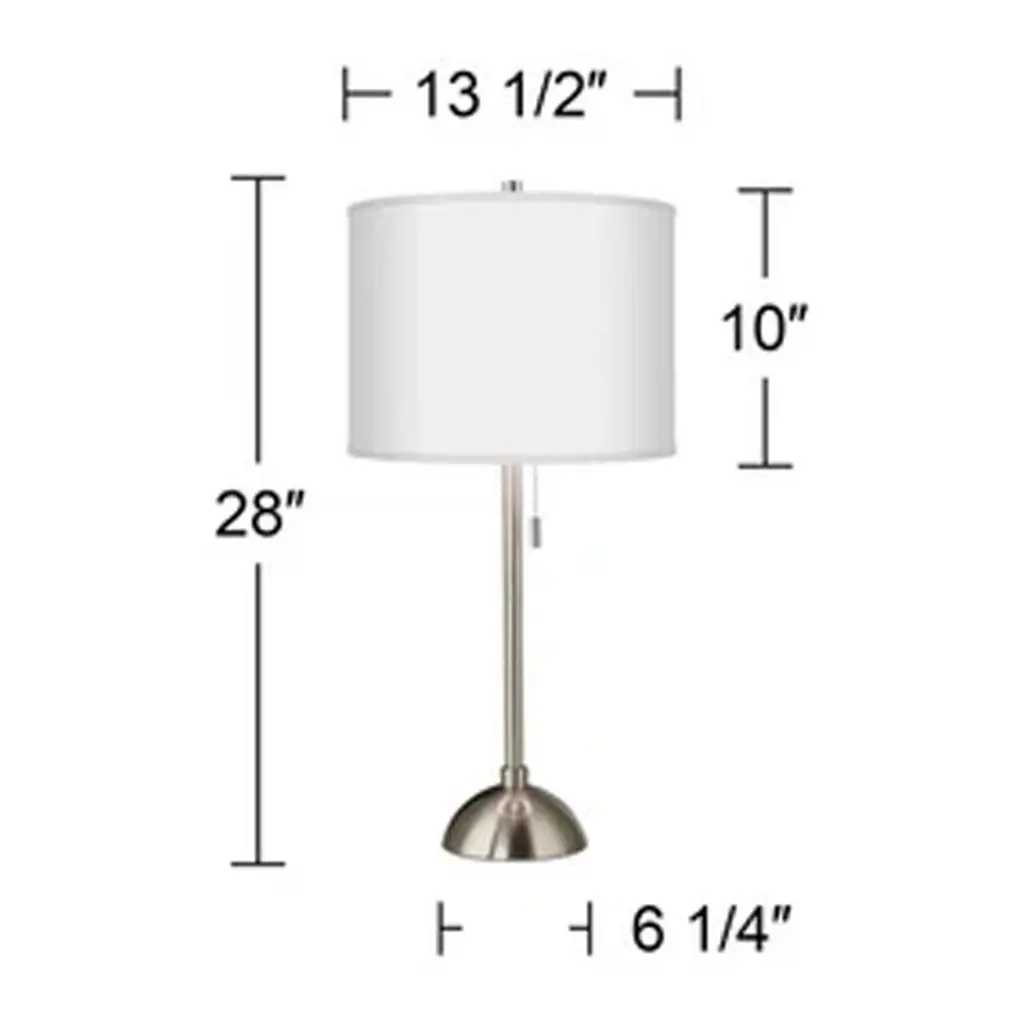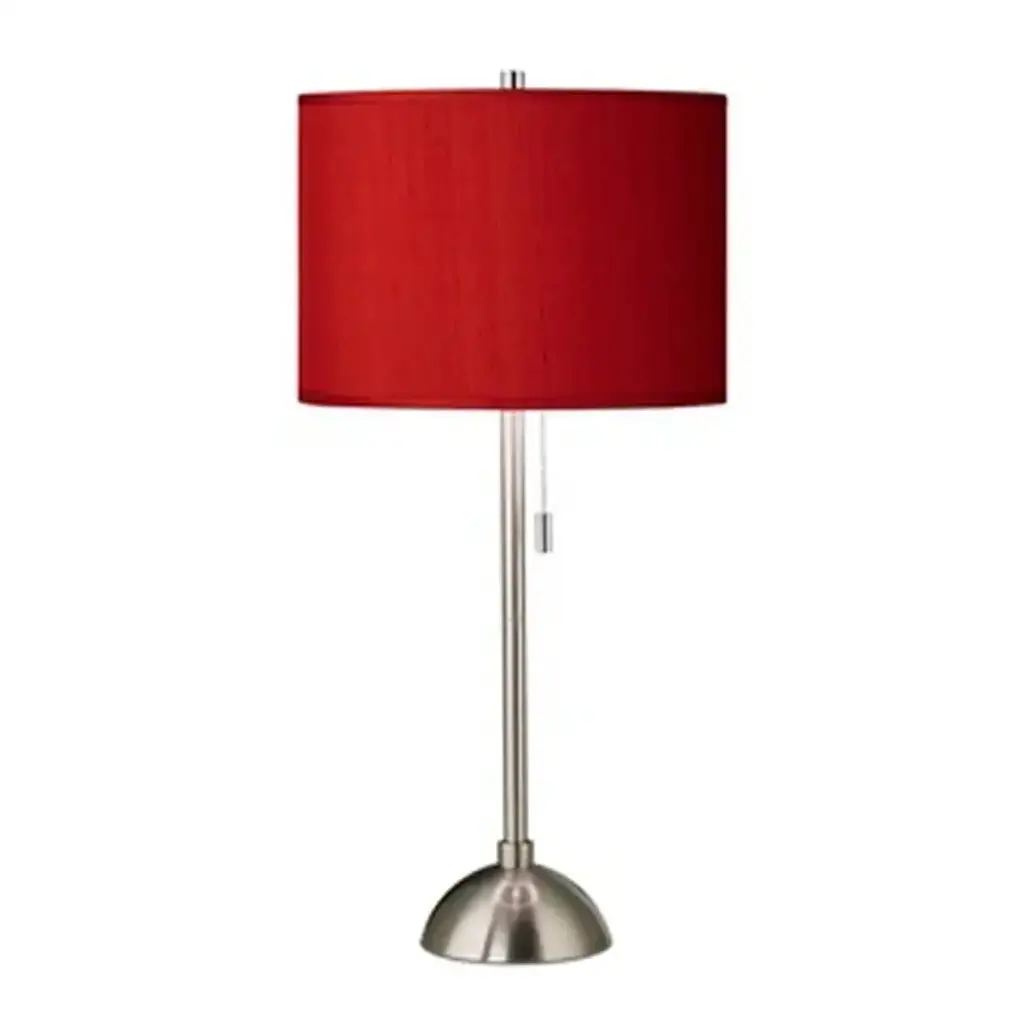 PRODUCT DETAILS: 28" high overall. Drum shade is 13 1/2" wide x 10" high. Weighs 5.2 lbs. Uses one maximum 100 watt standard-medium base bulb (not included). On-off pull chain switch. Modern table lamp design with a made-to-order, exclusive lamp shade. Brushed nickel finish metal base and accents. Made-to-order, handcrafted red faux silk lamp shade. Polyester material. 8-foot long cord. This modern table lamp offers a bright accent for any room. It features a stylish, custom-created red faux silk lamp shade on top of a thin profile brushed nickel finish metal lamp base. An on-off pull chain makes for convenient lighting control.