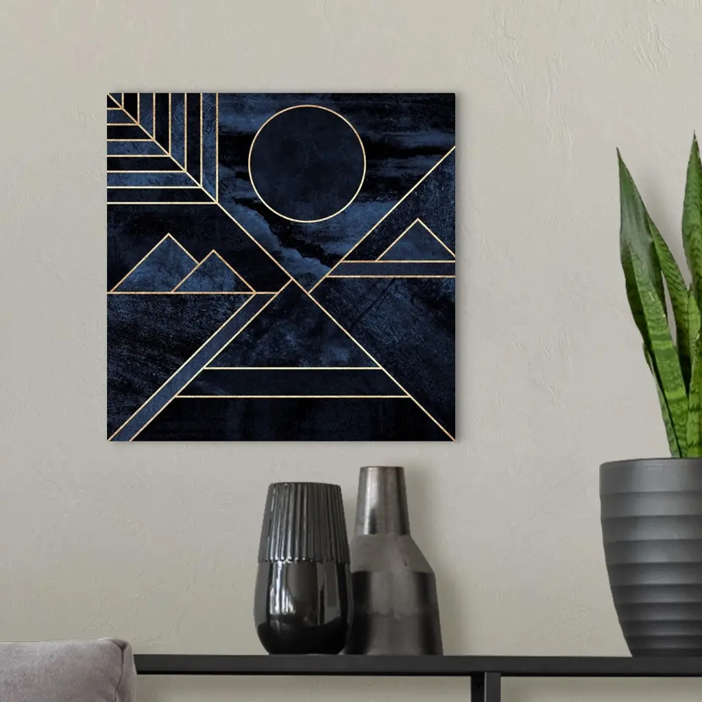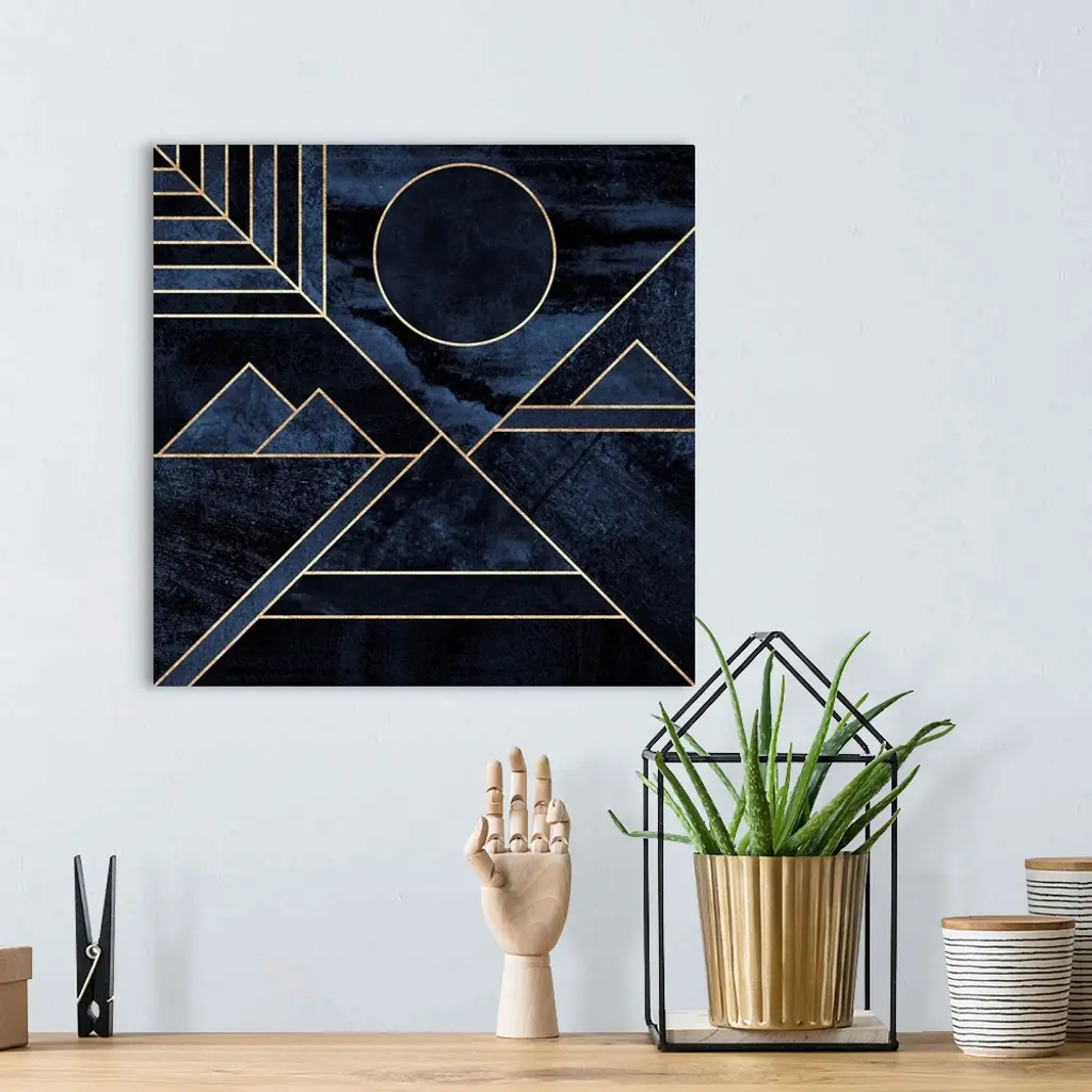 A contemporary, geometric, art deco design in shades of grey and blue. The shapes are outlined in gold and suggest a mountain landscape beneath a full moon.