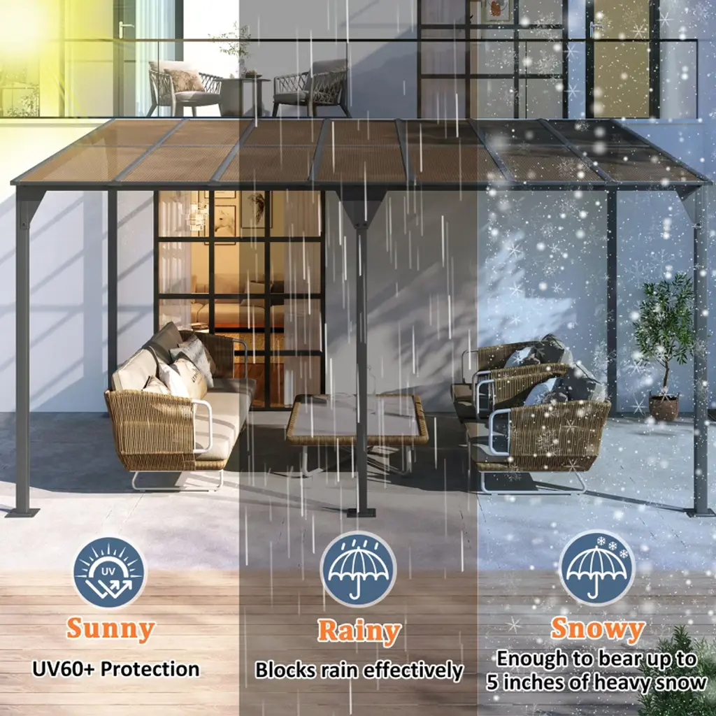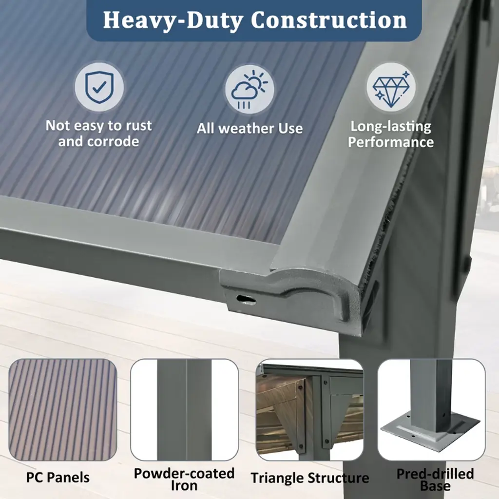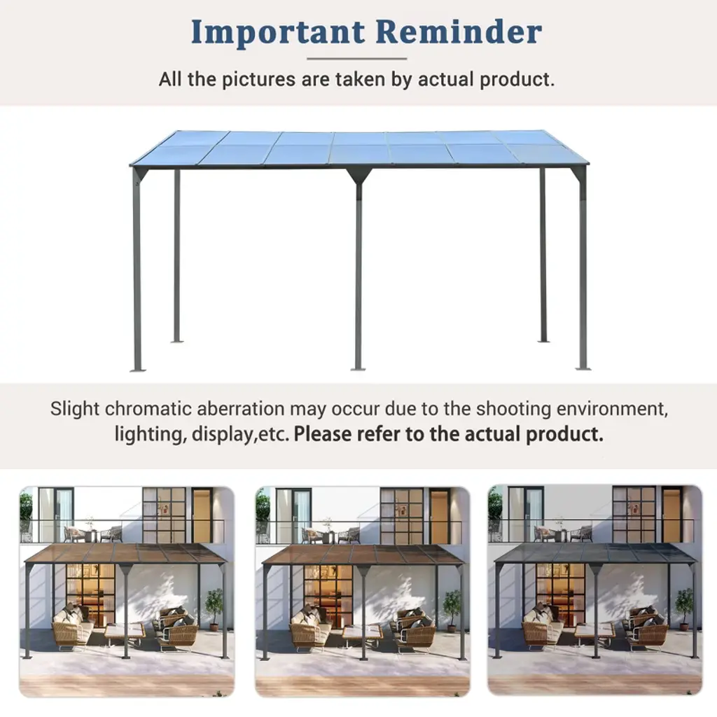 Expand your outdoor living space with this sturdy 14.76x9.22 FT Wall-Mounted Gazebo, designed to turn your deck, garden, or backyard into a versatile shelter for year-round enjoyment. Crafted from rust-resistant powder-coated iron and durable PC roof panels, it stands up to all weather—from scorching summers to snowy winters. The sloped roof ensures efficient water drainage, while UV60+ protection blocks harmful rays, keeping you cool and safe. With a spacious layout, it’s perfect for outdoor dining, entertaining, or relaxing. Easy to mount against a wall, this gray gazebo blends strength, functionality, and style, making it a lasting addition to your outdoor oasis. Specifications Material: Powder-Coated Iron+PC Panels. Overall Product Dimension: 14.76' W x 9.22' D x 8.5' H. Product Weight: 151.57 LBS.