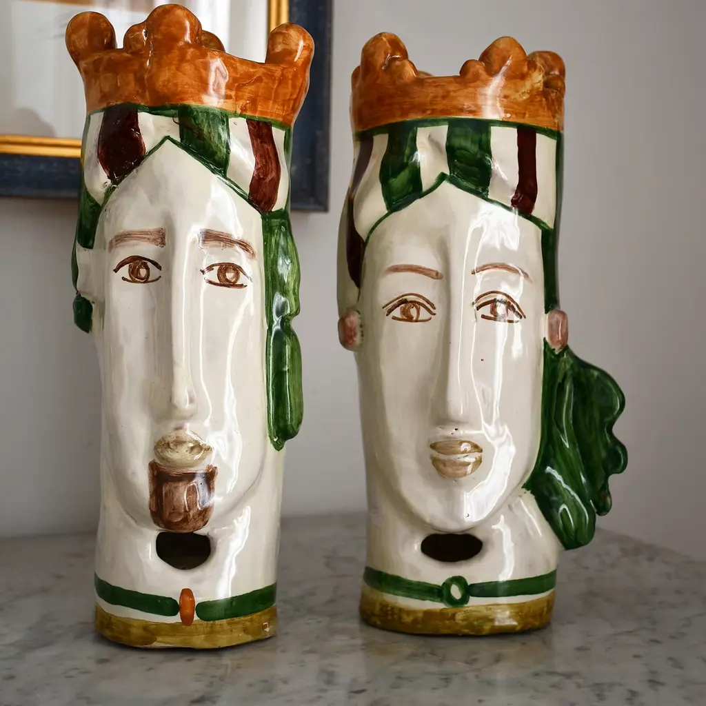 The elegant, dramatically elongated traits typical of Modigliani's faces inspired the artful design of the two modern Moor's heads composing this set. Fashioned of ceramic and minutely painted by hand in a combination of green and brown tones, each piece is a singular work of art at once celebrating Sicilian cultural roots and artisan artistry.