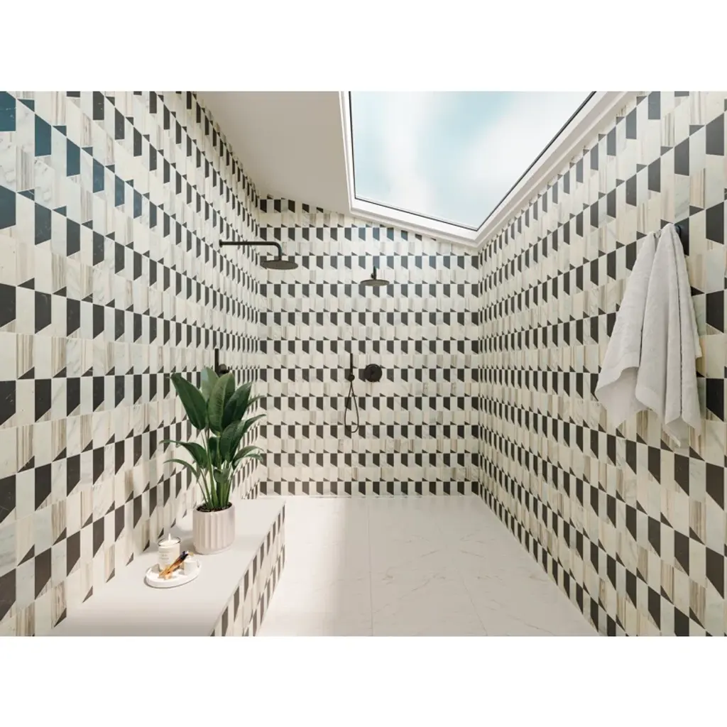 The Modni collection offers a refreshingly bold take on modern mosaics. Modni pairs warm and cool ones in unconventional shapes to deliver elegant patterns that border on extravagant. The marble blend motifs have a honed finish, giving the collection’s edgy style a bit of a softer side. Modni is perfect for statement walls, showers, and any space that’s craving attention.