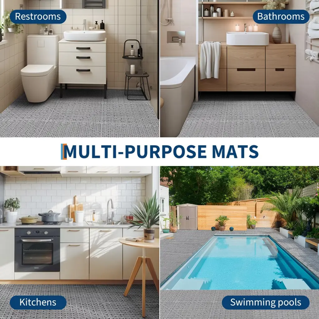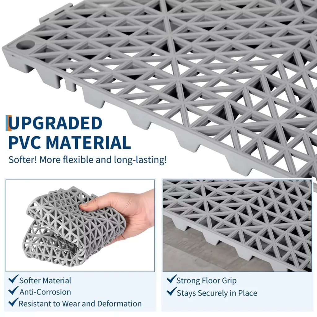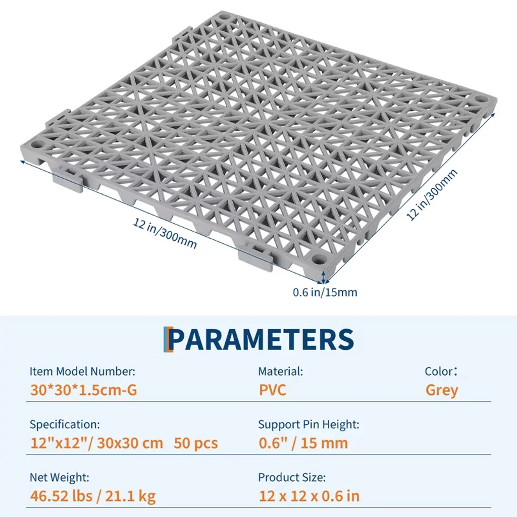 Transform your wet or high-traffic spaces with these durable, non-slip modular interlocking drainage tiles—featuring quick water drainage, effortless assembly, and easy cleaning, making them the perfect solution for pools, bathrooms, kitchens, and commercial areas!Product FeatureModular interlocking cushion for custom fitNon-slip interlocking floor tilesFast-draining splicing drainage mat designEasy-to-clean PVC drainage tilesDurable outdoormats with drainageEffortless assembly interlocking floor matsIdeal for bathrooms, pools, kitchens, and wet areasProduct InformationMaterial: PVCDimension: 12x12x0.59 inchColor: GreyPacking List50 x Interlocking Floor Tiles1 x Instruction Manual