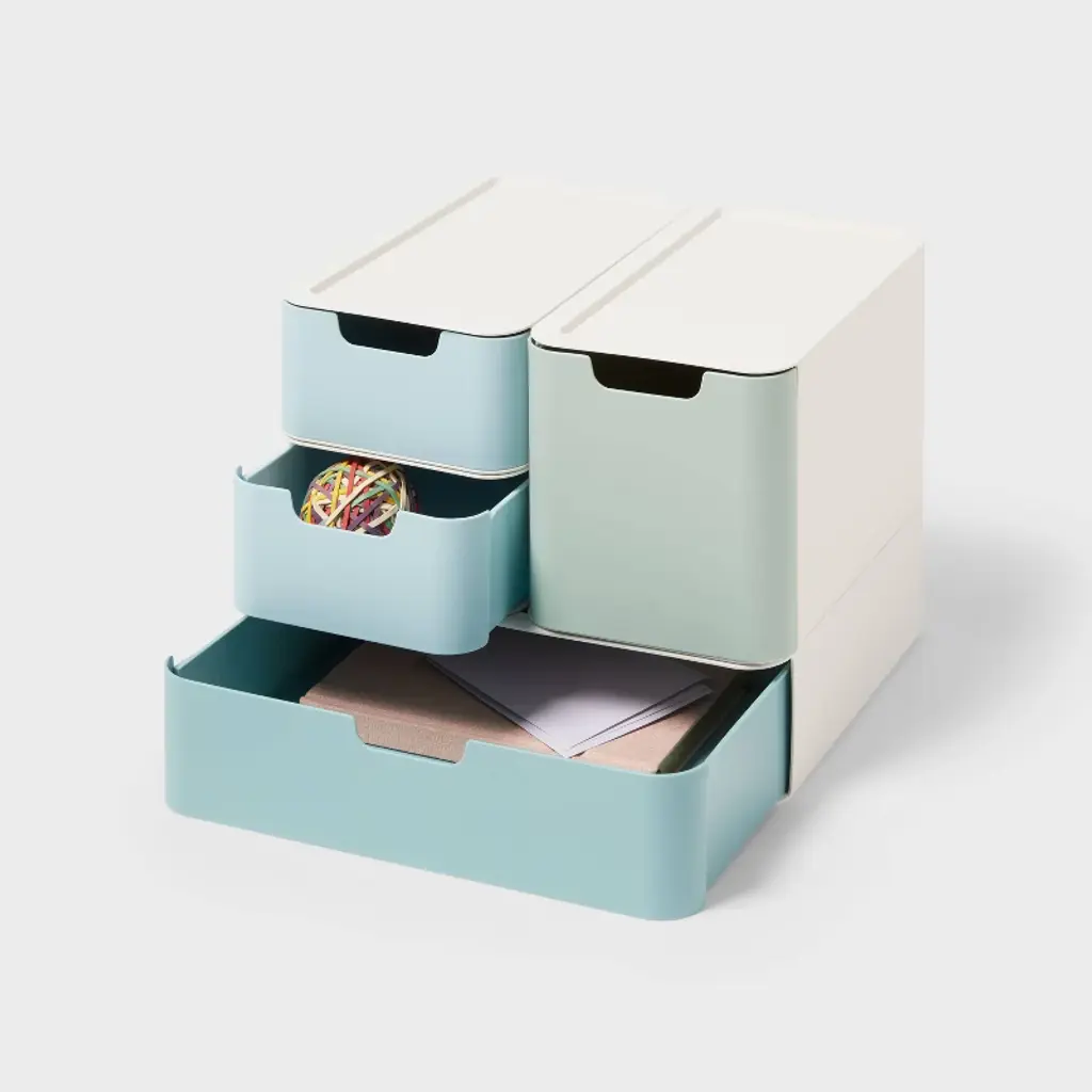 Store craft supplies, notepads and more with the Modular Storage Drawer Set from Brightroom™. This blue storage drawer set features four drawers in varying-sizes to give you enough space for your essentials. Made of post-consumer recycled plastic, this set has a cutout at the front for easy drawer opening. You can place it in your study, vanity area, or other spots to organize your essentials.Brightroom™: See your space in a new light.Small Drawer Width: 6.15 inchesSmall Drawer Height: 3.1 inchesSmall Drawer Depth: 10.4 inchesMedium Drawer Width: 6.15 inchesMedium Drawer Height: 6.2 inchesMedium Drawer Depth: 10.4 inchesLarge Drawer Width: 12.3 inchesLarge Drawer Height: 3.1 inchesLarge Drawer Depth: 10.4 inchesOverall Width: 12.3 inchesOverall Height: 9.3 inchesOverall Depth: 10.4 inches