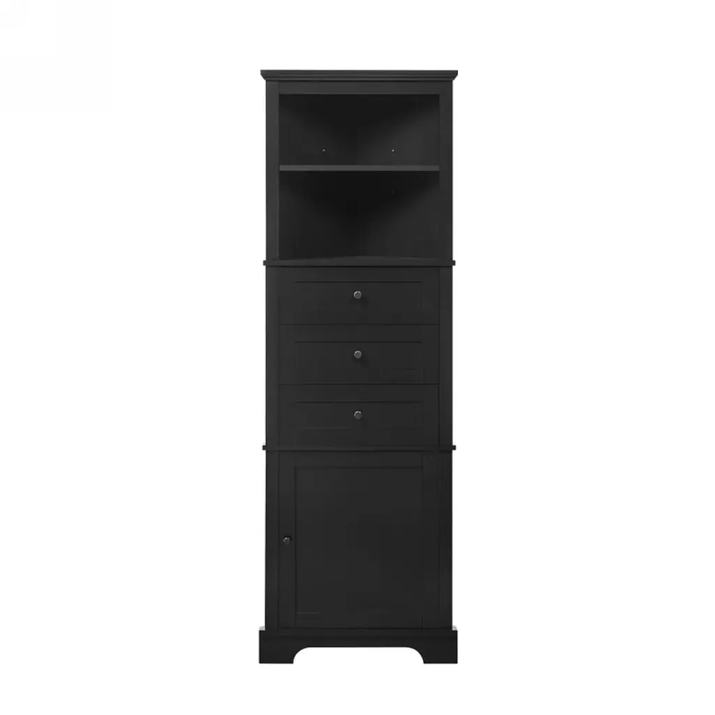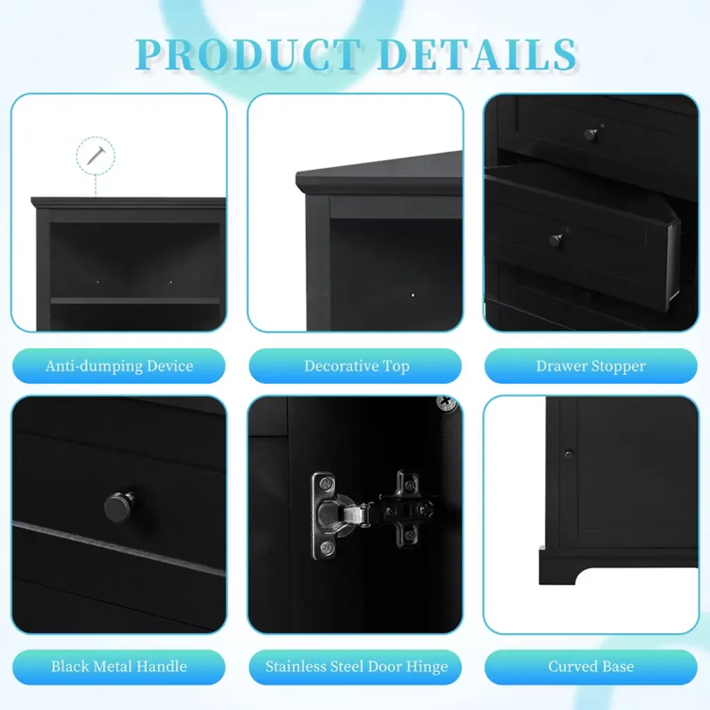 Durable and Water-Resistant MDF Construction: This corner cabinet is crafted from premium MDF (Medium-Density Fiberboard) panels, known for its sturdiness and long-lasting durability. The MDF boards are coated with a sleek, painted finish that not only adds a touch of elegance but also ensures the surface is splash-proof. Whether it's in a bathroom, kitchen, or any other humid environment, this cabinet remains sturdy and easy to maintain, providing you with reliable storage for years toHigh-Quality Metal Handles for Added Strength: Designed with heavy-duty metal handles, this cabinet combines both functionality and style. The robust handles are built to withstand frequent use and provide a comfortable grip when opening and closing the doors. These metal handles not only add a modern touch to the cabinet’s appearance but also enhance its overall sturdiness, ensuring smooth operation for everyday use.Versatile Storage Design for Every Need: This corner cabinet is designed with a variety of storage options to meet your daily organization needs. The upper open shelf provides easy access for items you use frequently, while the three triangular drawers in the middle offer ample space to store smaller items such as stationery, cosmetics, or accessories. Below, the enclosed cabinet with doors ensures that larger items or personal belongings are kept neatly out of sight, protected from dust, and stSafety and Stability with Drawer Stoppers: Each of the three middle triangle drawers is equipped with a stopper mechanism that ensures the drawer stays securely in place when opening or closing. This feature not only prevents the drawers from being pulled out too far but also enhances the stability and safety of the unit. The drawers will stay in place even during everyday use, offering you peace of mind. (Please note: assembly is required for this feature.)Customizable Storage for Various Items: The adjustable shelf design offers ultimate flexibility, allowing you to customize the space to fit items of different sizes. Whether you need to store tall bottles of shampoo, small jars of body lotion, or stacks of towels, this feature lets you easily modify the shelf height to accommodate your specific needs. This makes the cabinet perfect for any room, from bathrooms to kitchens, where the size of items can vary greatly.Maximizes Organization and Accessibility: With the ability to adjust the shelf height, this corner cabinet helps you maintain a tidy and organized space while keeping your essentials easily accessible. You can efficiently organize everything from toiletries to cleaning supplies, ensuring that each item has its place. The convenience of adjustable shelves makes it easy to store and retrieve items, reducing clutter and enhancing the functionality of your living space.Wide Application - This tall corner cabinet, placed in the corner, does not take up space. It is suitable for limited spaces, such as bathroom, kitchen, dining room, living room, and anywhere you want. What's more, the whole white body will fit any decoration style. It could add more sleek elements to your home.Package & Easy Installation - This product requires assembly. There are holes reserved in the MDF boards for easy installation. What's more, the install instruction manual and hardware pack will be shipped with the product to ensure users accomplish a successful installation.