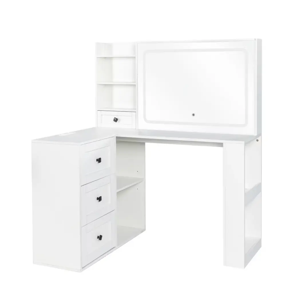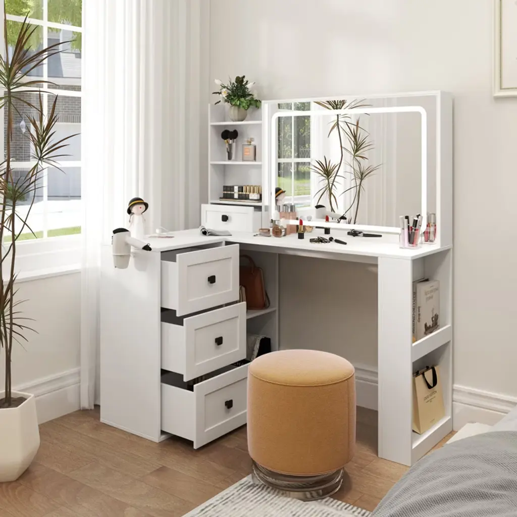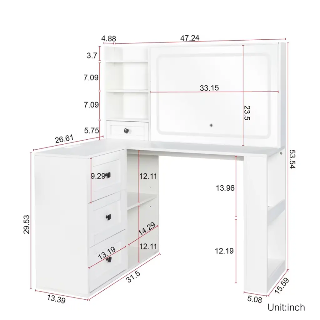 If you are looking for an exquisite best-in-class dressing table, you must not miss this elegant classic dressing table set. It comes with 3 large drawers, 7 open shelves, and one mirror with LED lights. The large rectangular cosmetic mirror provides a wider view and makes makeup easier. Perfect for home, work, hair salon, and studio makeup.3 color temperature LED lights can be switched, you can change the color or brightness according to any scene or makeup needs, which allows you to better control the lighting and room atmosphere and helps you create the best makeup look every day. There is a built-in charging board on the desktop, which does not take up much space and is convenient for using hair curlers, hair dryers, beauty instruments, mobile phone charging.The size of this dressing table set is 47.24"(L)x26.61"(W)x53.54"(H), it has a spacious tabletop and 3 large drawers that provide the perfect space to store and organize your precious lipsticks, eye shadows, makeup, perfumes, jewelry, other beauty supplies, and more in different places. Wonderful gifts for yourself, your wife, your mom, your girls. Material is 15mm particle bpard,back board is 3mm MDF. Made of wooden structure with melamine finish for durability and easy maintenance.