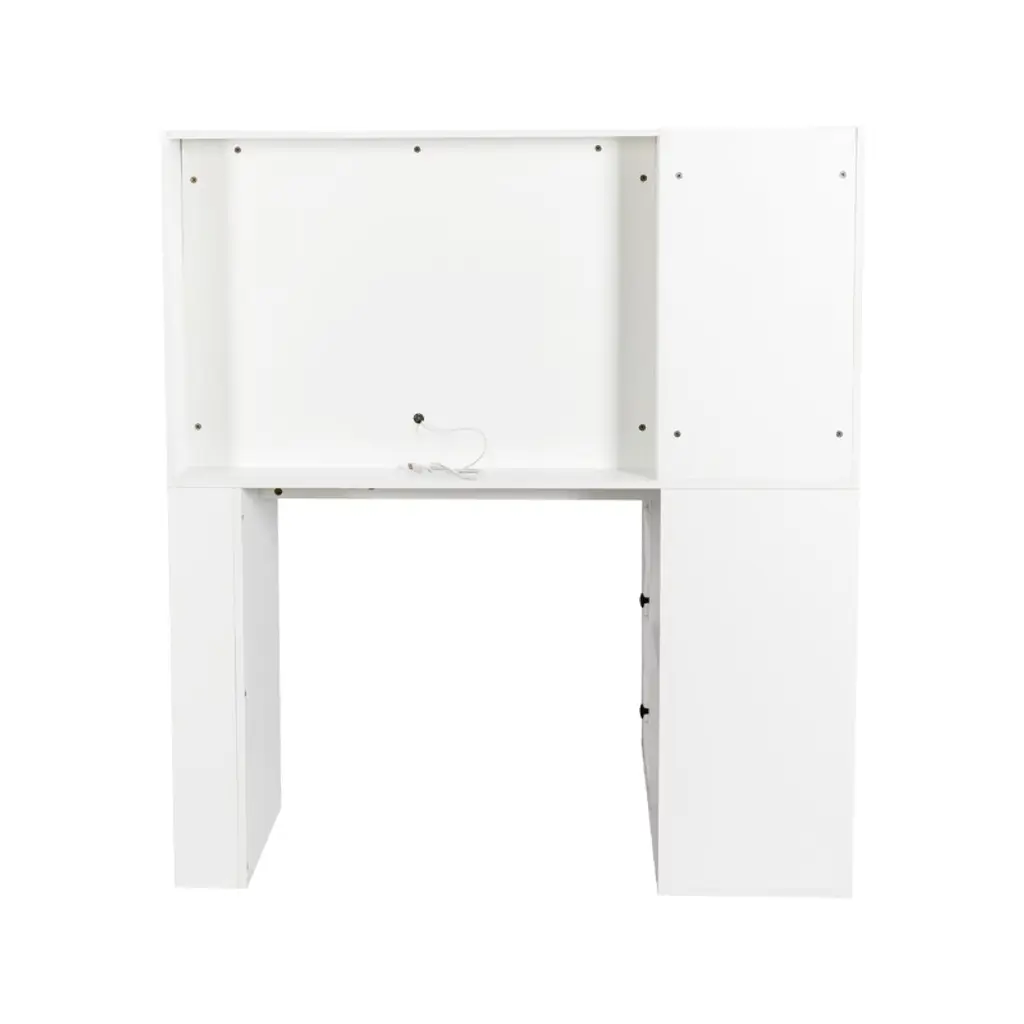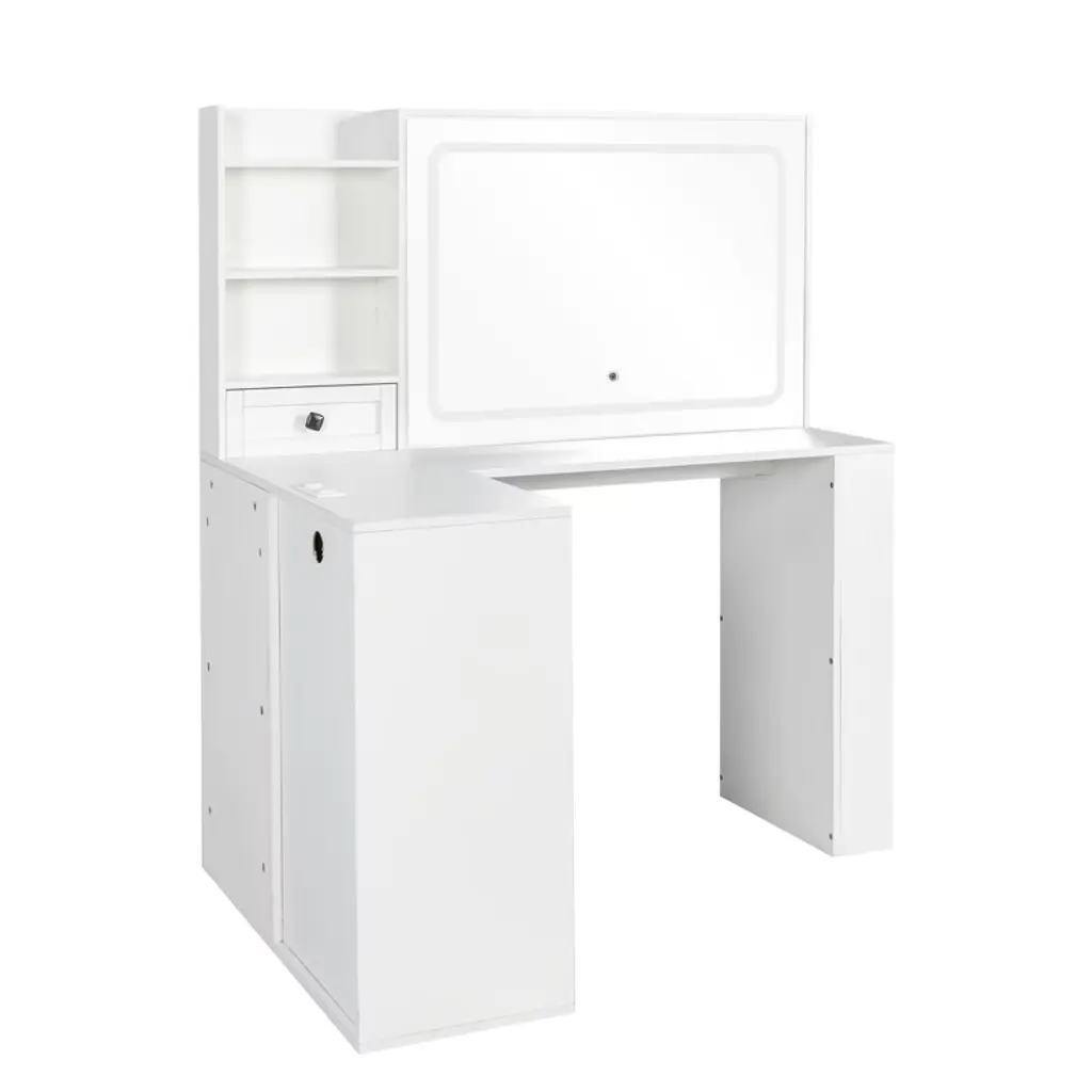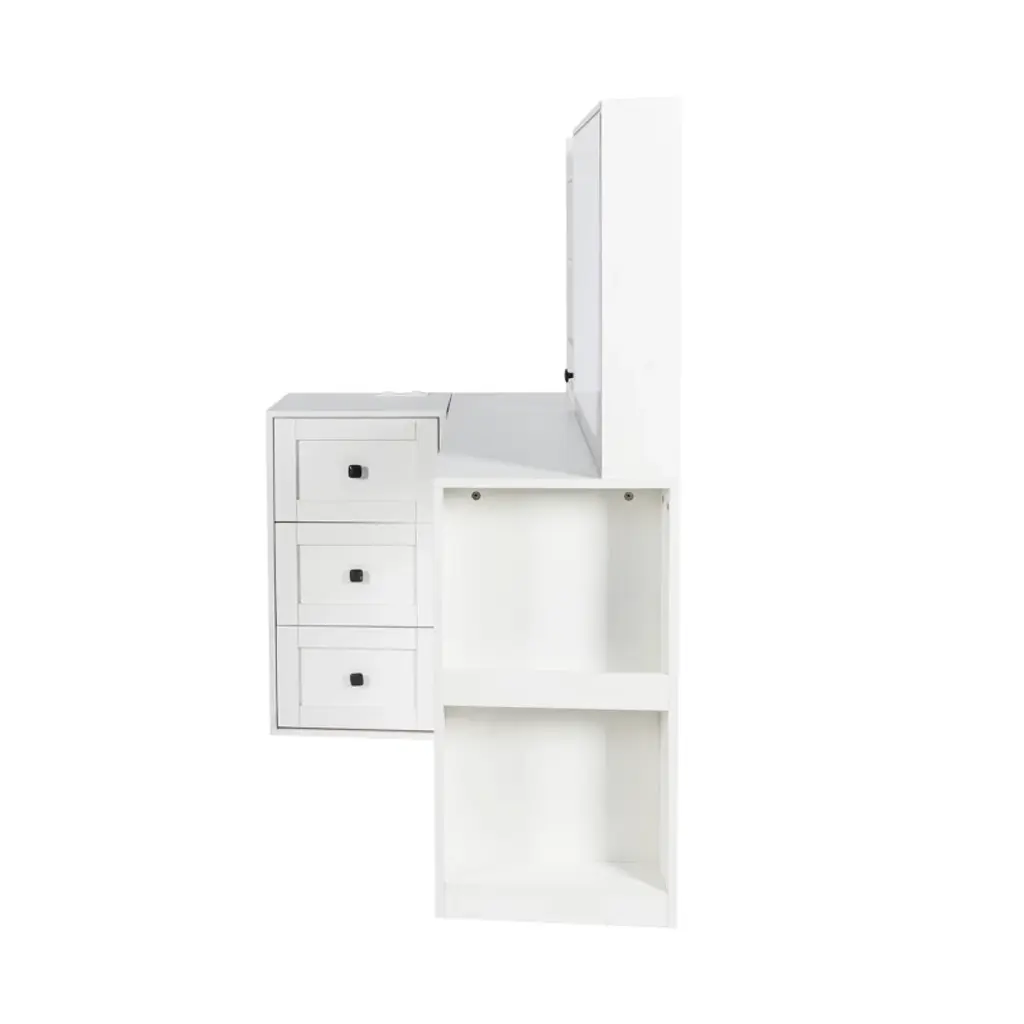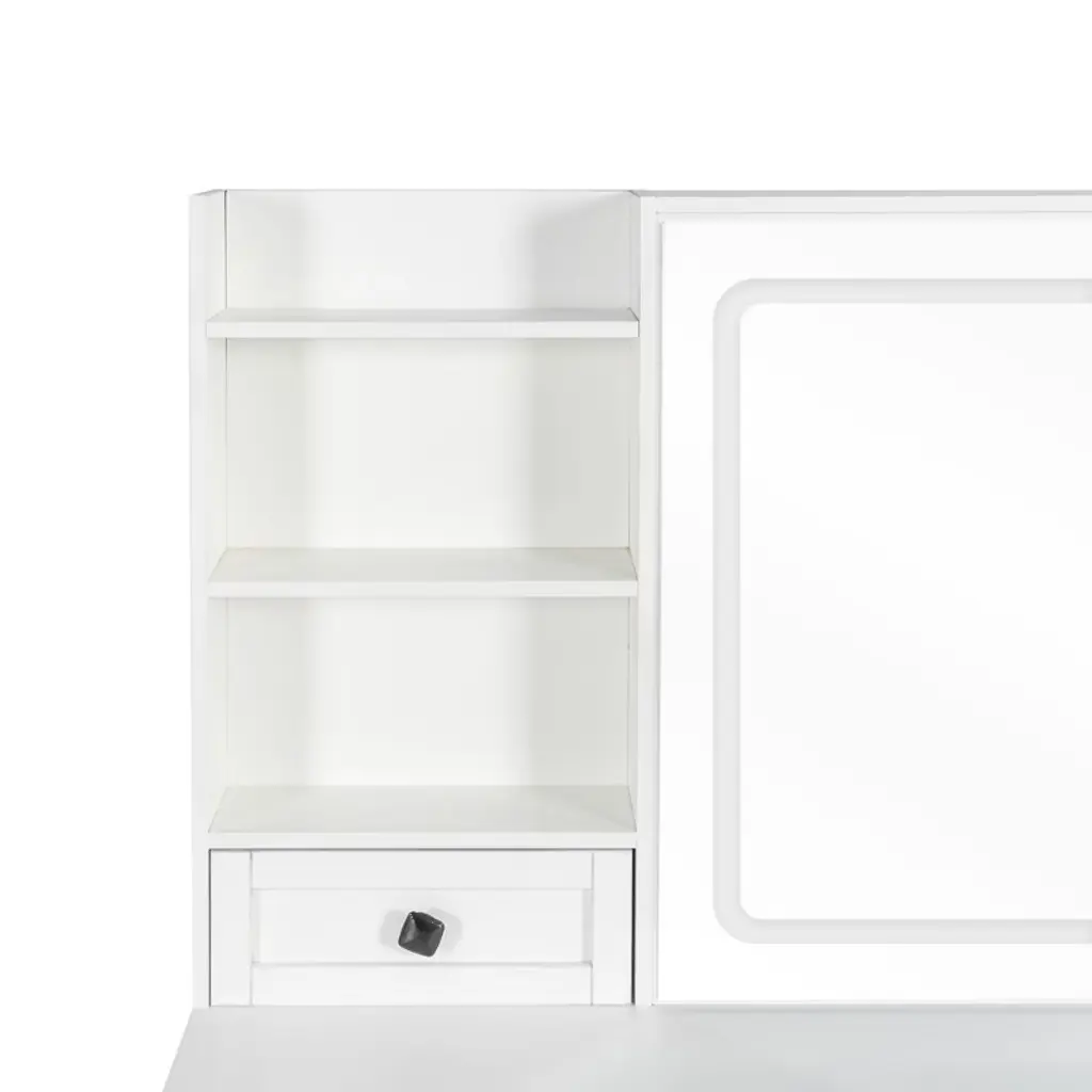 If you are looking for an exquisite best-in-class dressing table, you must not miss this elegant classic dressing table set. It comes with 3 large drawers, 7 open shelves, and one mirror with LED lights. The large rectangular cosmetic mirror provides a wider view and makes makeup easier. Perfect for home, work, hair salon, and studio makeup.3 color temperature LED lights can be switched, you can change the color or brightness according to any scene or makeup needs, which allows you to better control the lighting and room atmosphere and helps you create the best makeup look every day. There is a built-in charging board on the desktop, which does not take up much space and is convenient for using hair curlers, hair dryers, beauty instruments, mobile phone charging.The size of this dressing table set is 47.24"(L)x26.61"(W)x53.54"(H), it has a spacious tabletop and 3 large drawers that provide the perfect space to store and organize your precious lipsticks, eye shadows, makeup, perfumes, jewelry, other beauty supplies, and more in different places. Wonderful gifts for yourself, your wife, your mom, your girls. Material is 15mm particle bpard,back board is 3mm MDF. Made of wooden structure with melamine finish for durability and easy maintenance.
