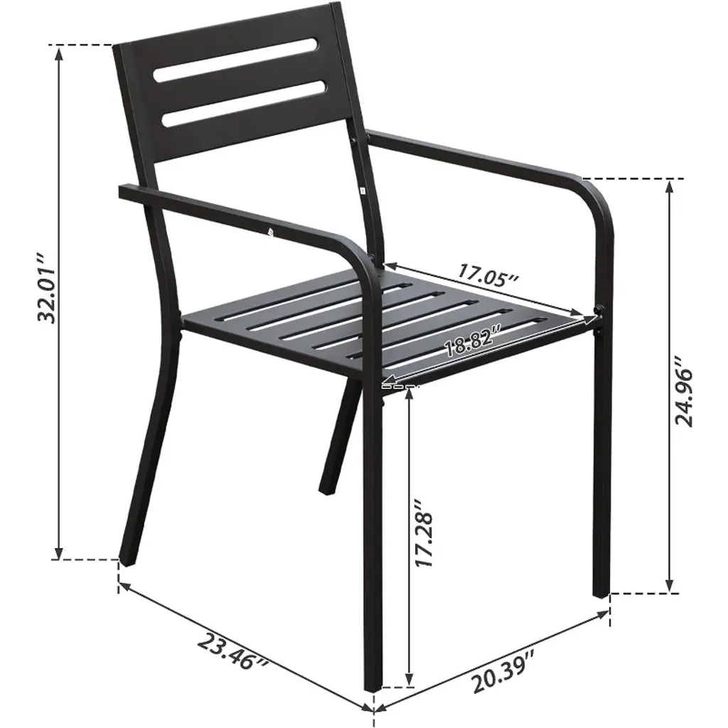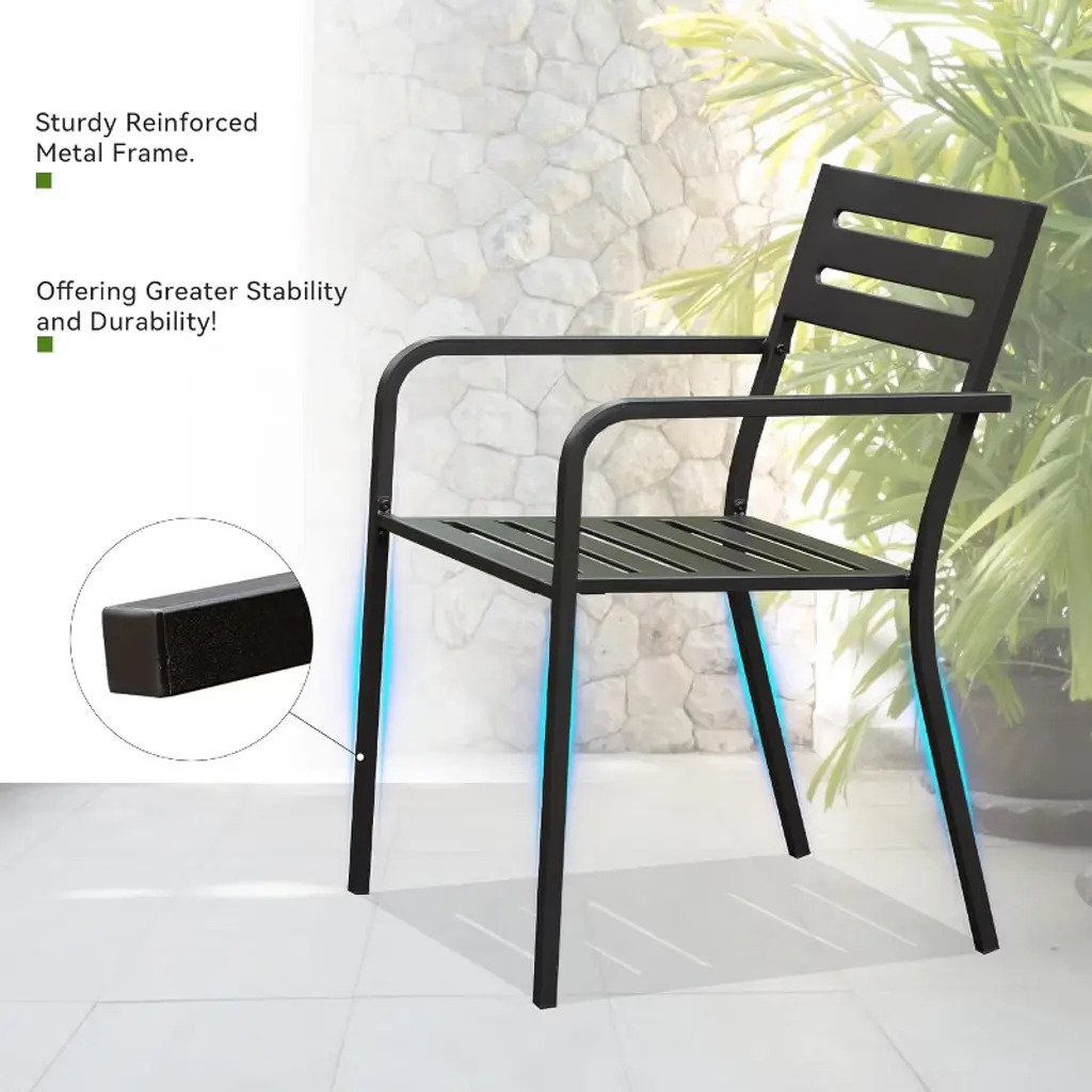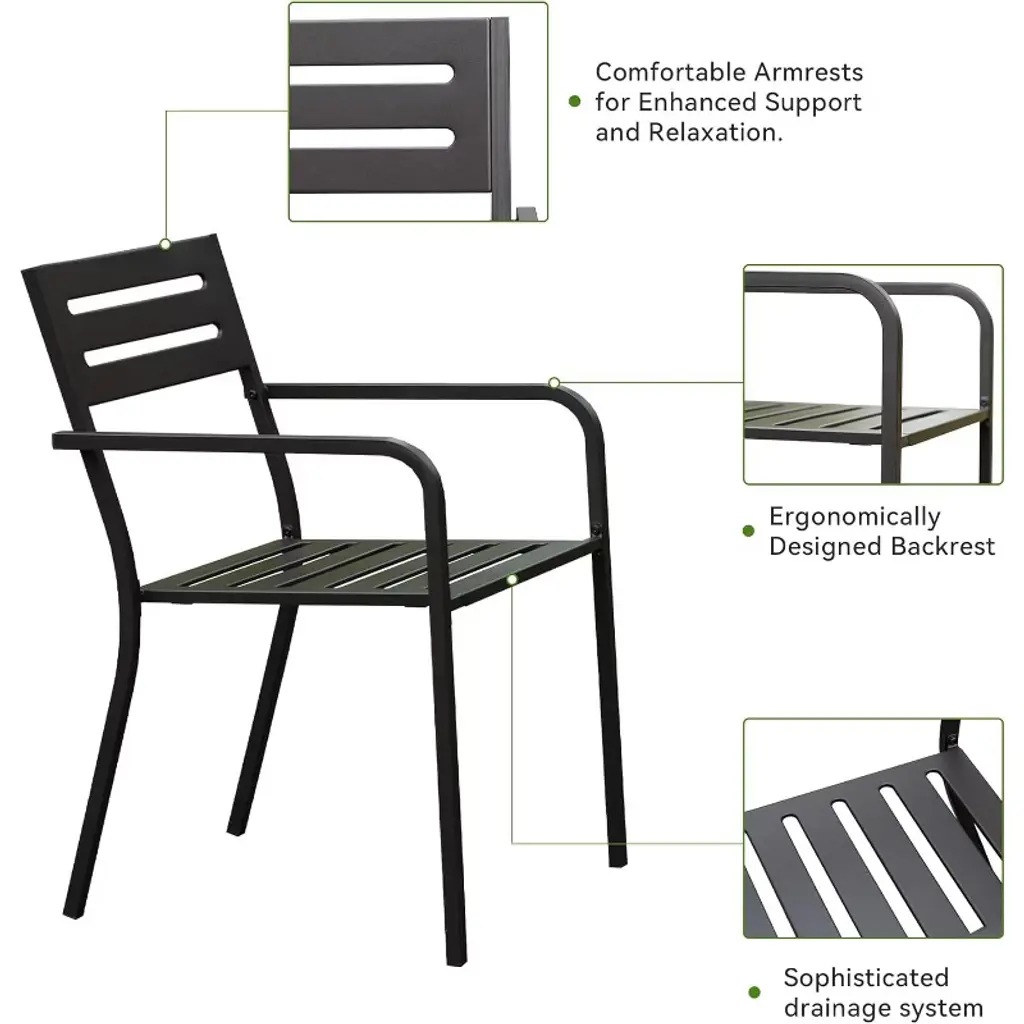 Set of 4 Chairs: The patio chairs are sold as a set of four, perfectly meeting the needs of family gatherings or everyday use. Each chair can be used individually or combined as needed, offering flexible seating options for various occasions. Space-Saving Stackable Design: The patio chair features an innovative stackable design that solves storage issues. When not in use, it can be easily stacked to save space, keeping your area neat and organized. Powder-Coated Metal Frame: Made from iron with a powder-coated finish, the metal chair offers water and rust resistance while enhancing strength and durability for long-lasting use. Ergonomic Armrests: The ergonomically designed armrests of the stackable chair provide a comfortable grip, reduce pressure, and prevent hand fatigue, ensuring optimal support for extended use. Easy Assembly: Assembly of the bistro chair is quick and simple, and a detailed instruction manual is included for your convenience. Whether for home use or outdoor settings, it saves you time on installation and allows you to enjoy it with ease.